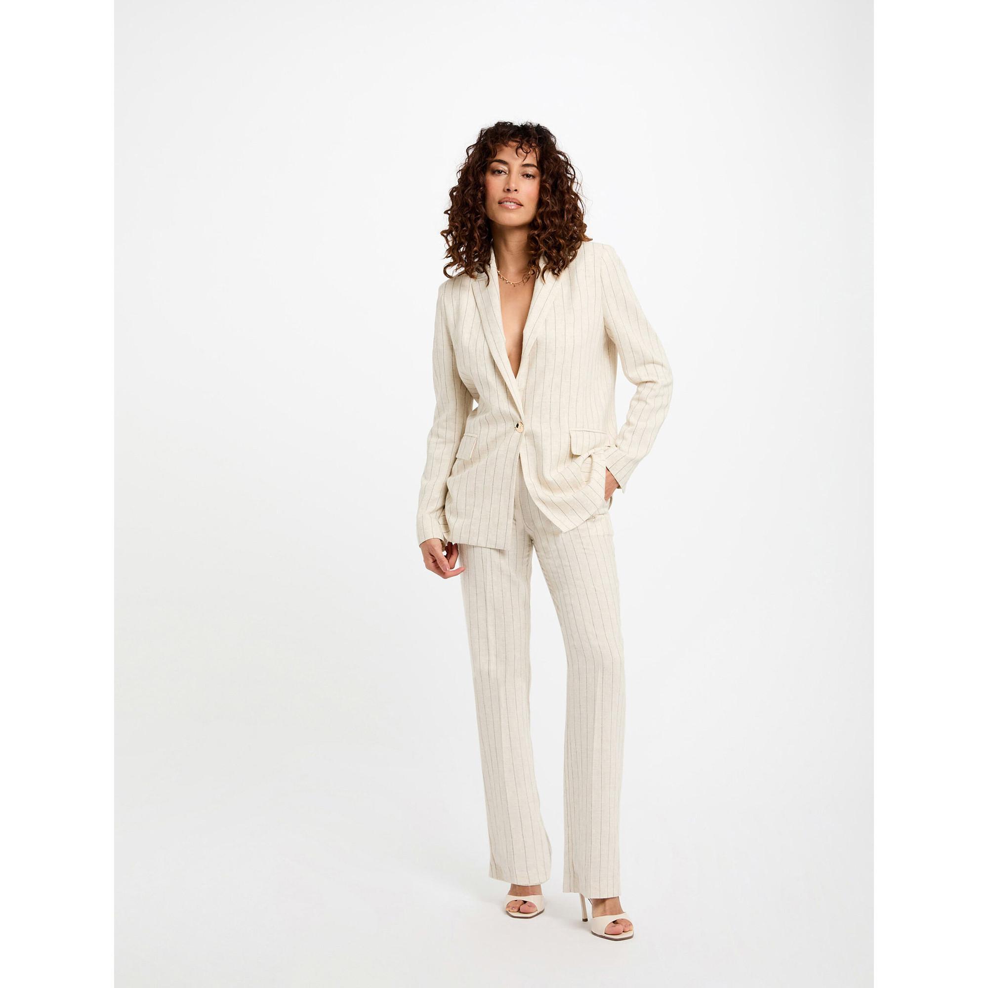 Questo blazer presenta un design classico con chiusura a un bottone e un motivo a righe. Include due tasche con patta sul davanti, aggiungendo stile e funzionalità. Il blazer è progettato con un revers dentellato, contribuendo al suo aspetto sofisticato. Il taglio leggermente sagomato e le rifiniture curate conferiscono un aspetto ordinato, completando il look con un'eleganza moderna.