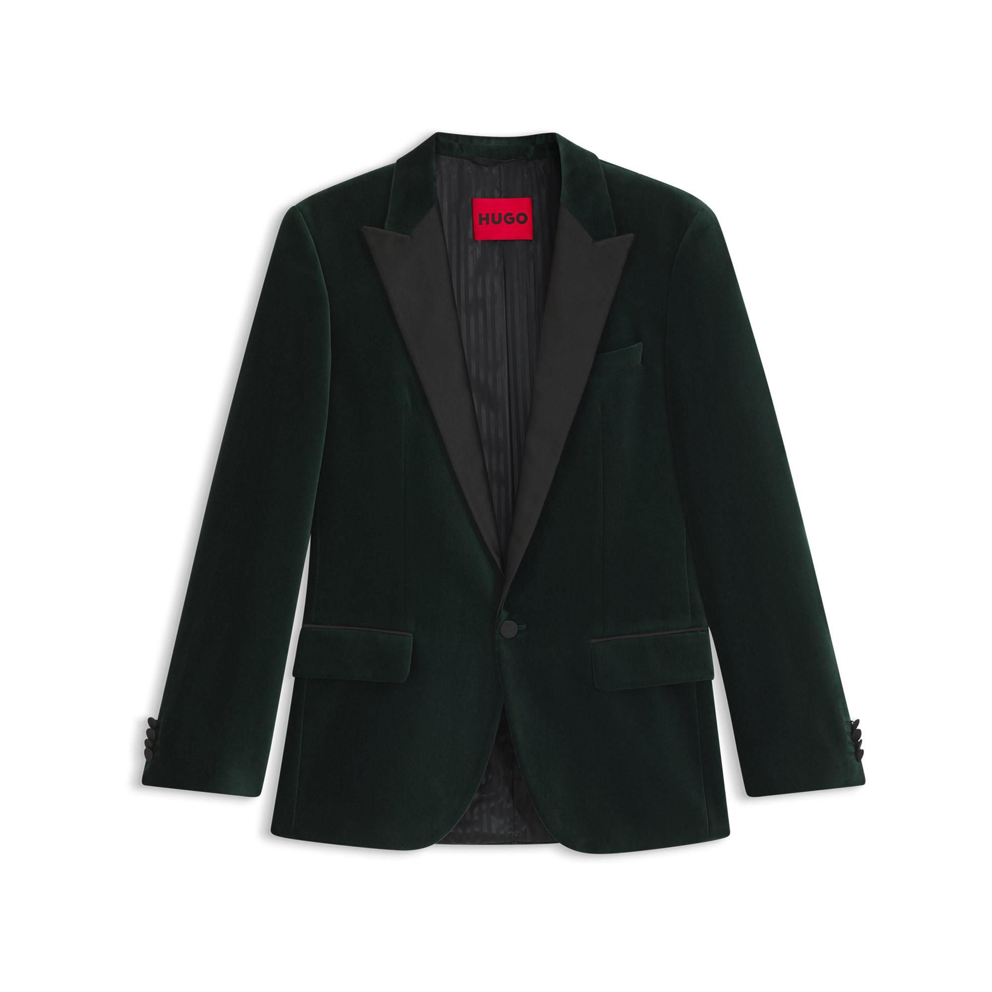 Questo blazer Hugo presenta una lussuosa finitura in velluto, offrendo un look sofisticato ed elegante. Il design include un classico colletto a revers e una chiusura a un bottone, rendendolo adatto per occasioni formali o per aggiungere un tocco raffinato a un outfit.