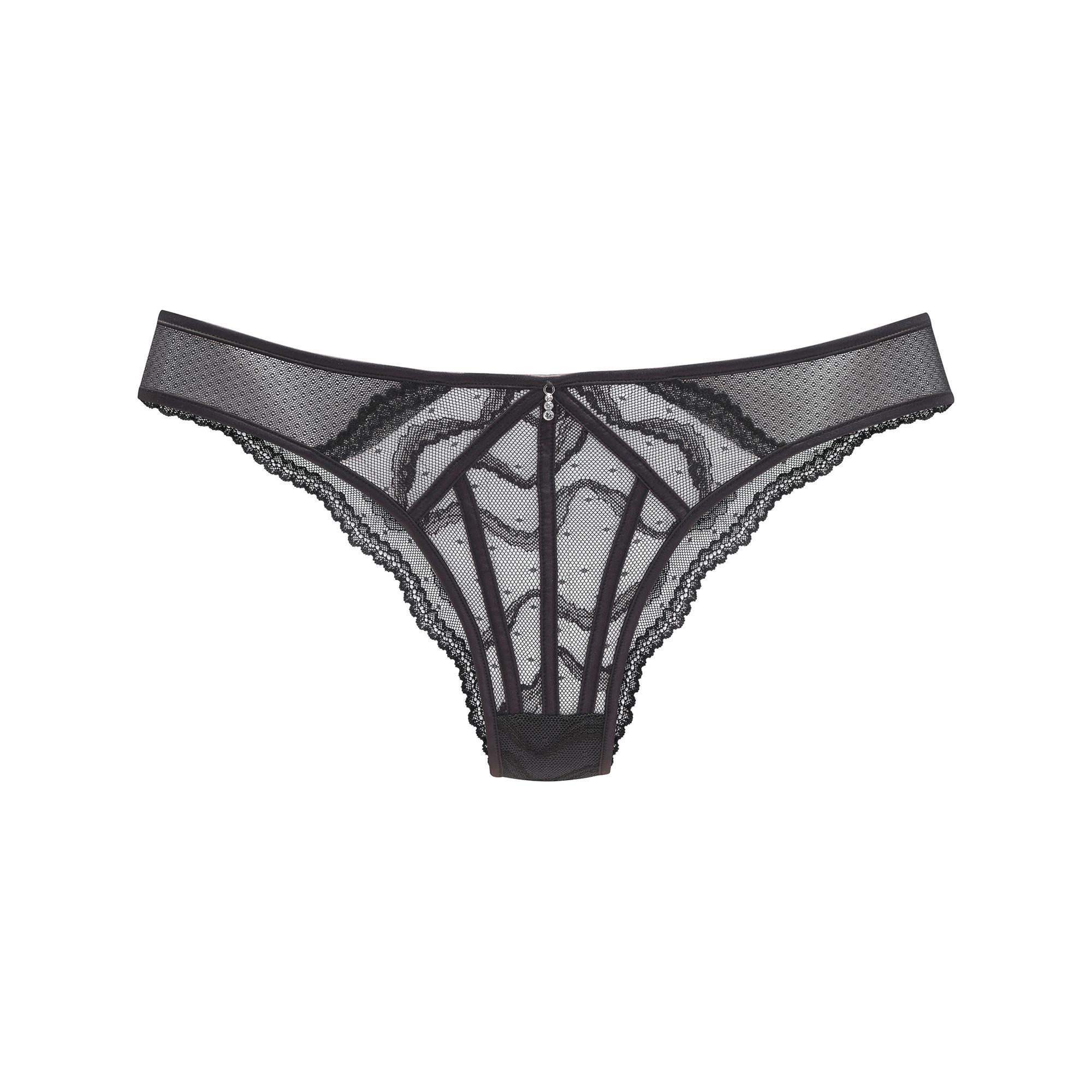 Il tanga conquista con nastri decorativi in satin sul davanti e un mix raffinato di pizzo leggero e mesh elegante. Un accessorio brillante al centro dona un tocco sofisticato.