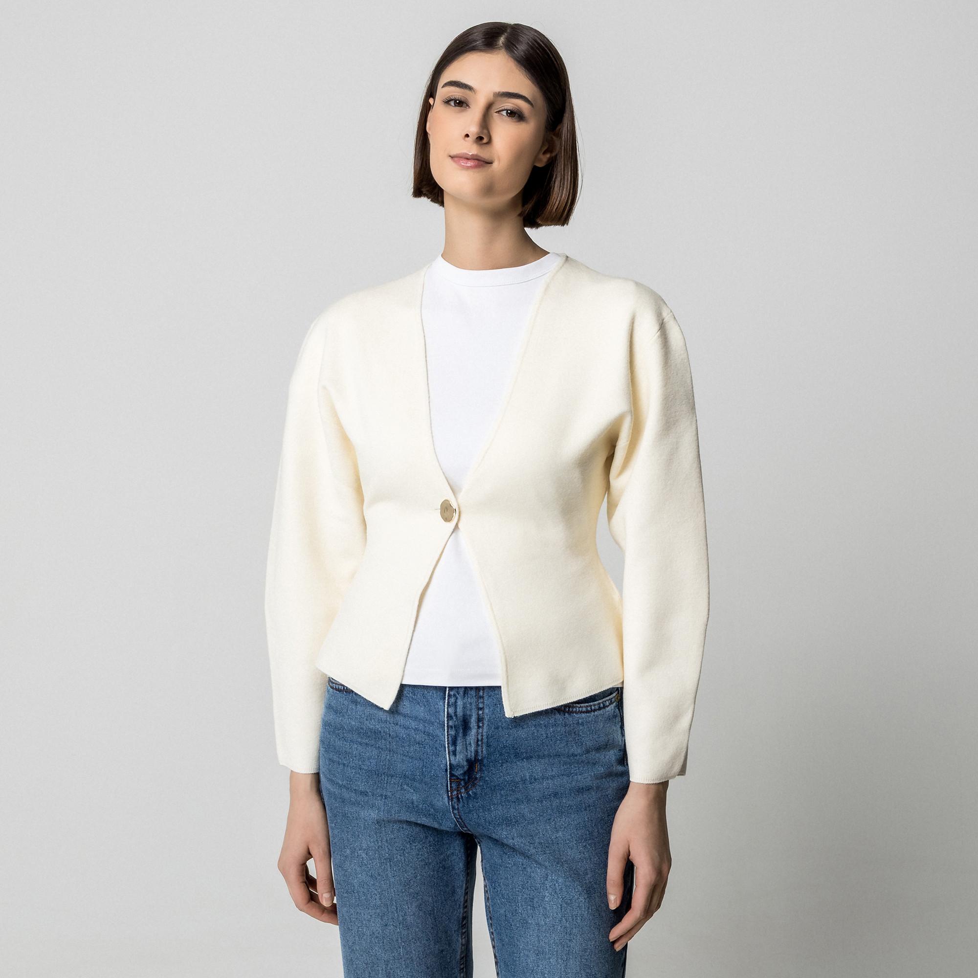 Questo cardigan presenta un classico design a scollo a V, offrendo un'opzione di stratificazione versatile per vari outfit. La chiusura a bottone singolo sul davanti conferisce un aspetto ordinato e raffinato.