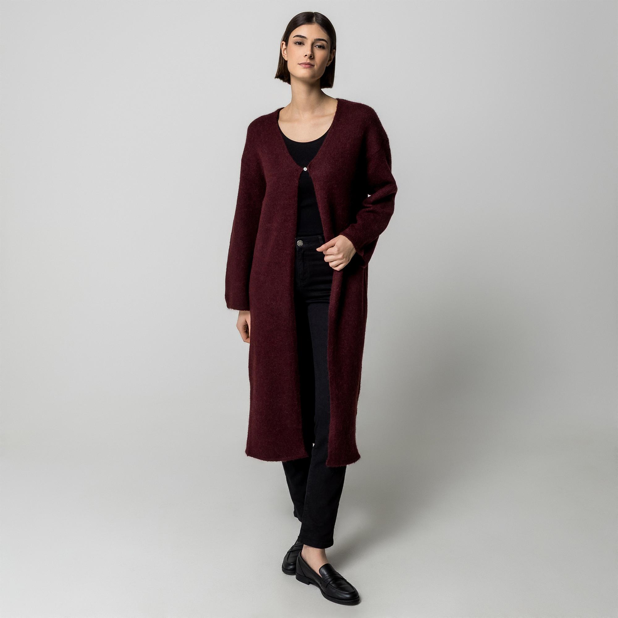 Questo cardigan lungo offre un'opzione di stratificazione versatile per vari outfit. La sua lunghezza estesa fornisce una copertura aggiuntiva e una silhouette rilassata, rendendolo adatto sia per occasioni casual che più eleganti. Il design presenta una semplice chiusura frontale, che consente una facile vestibilità e adattabilità a diversi stili.