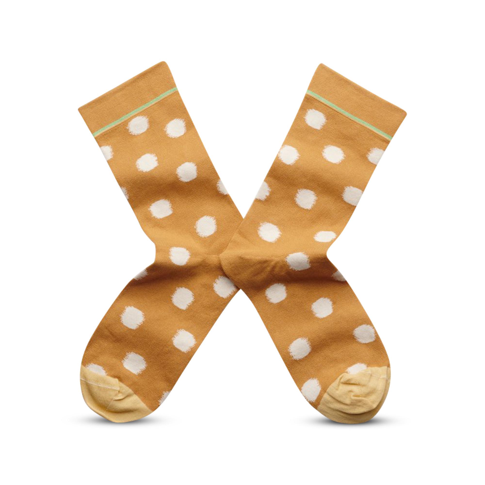 I calzini mostrano un motivo a pois naturali su sfondo marrone ocra, con bordi in giallo sbiadito e verde lichene. La punta è in giallo sbiadito e crea un contrasto cromatico. Questi calzini a mezza altezza sono realizzati con cotone egiziano fine.