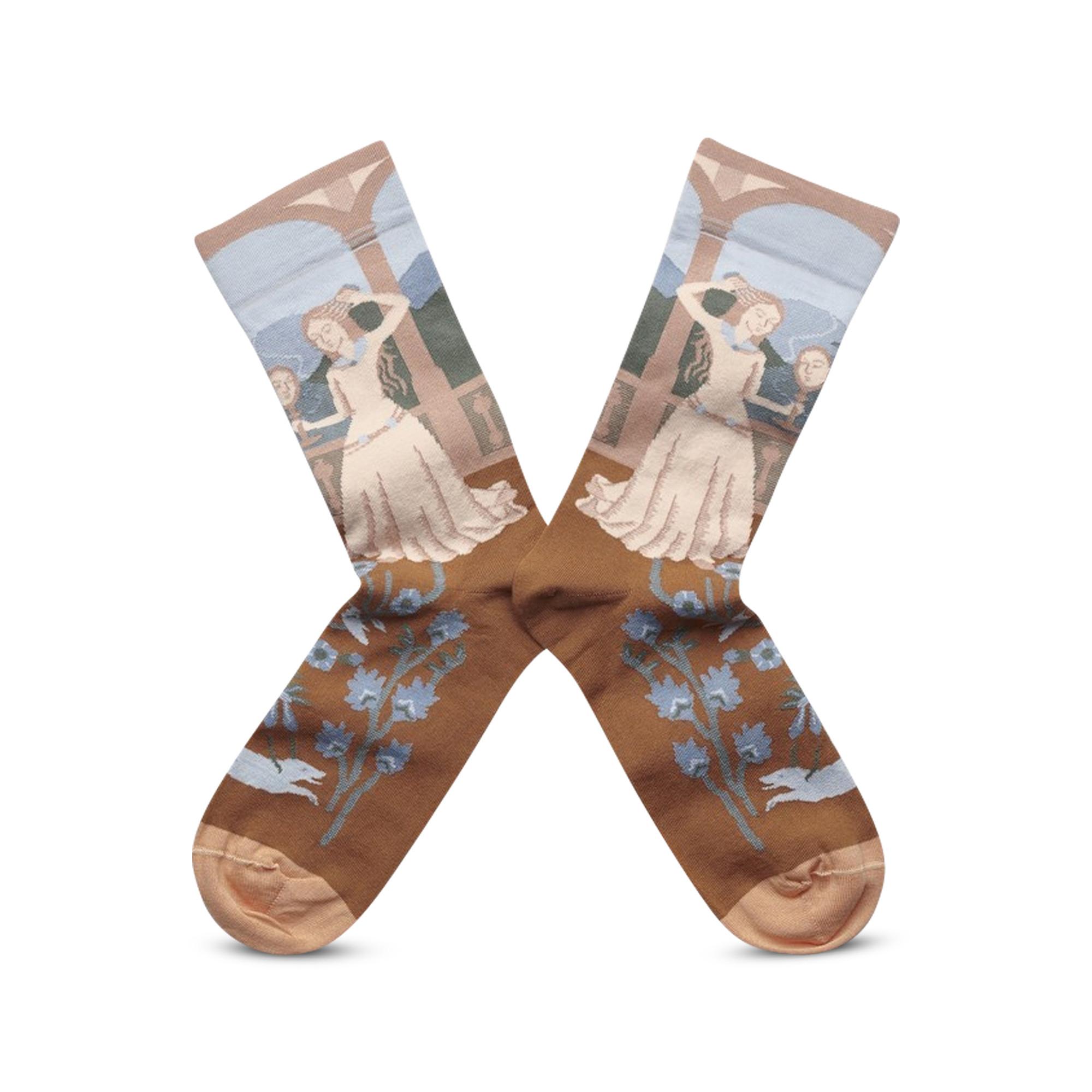 I calzini “Sky Princess” raffigurano un motivo fiabesco con una principessa fluttuante su sfondo azzurro cielo. I colori sono delicati e giocosi, con un dettaglio a contrasto sulla punta. Questi calzini a mezza altezza sono realizzati in cotone egiziano fine e prodotti in Francia e Portogallo.