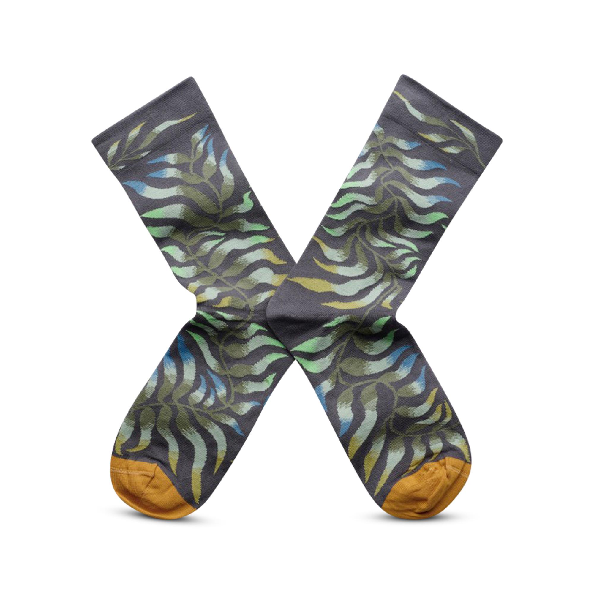 Questi gambaletti mostrano un motivo di foglie delicate in verde lichene, verde cedro, blu onda e blu paradiso su sfondo blu acciaio. La punta è in marrone ocra e crea un contrasto caldo. Questi calzini a mezza altezza sono realizzati con cotone egiziano fine.