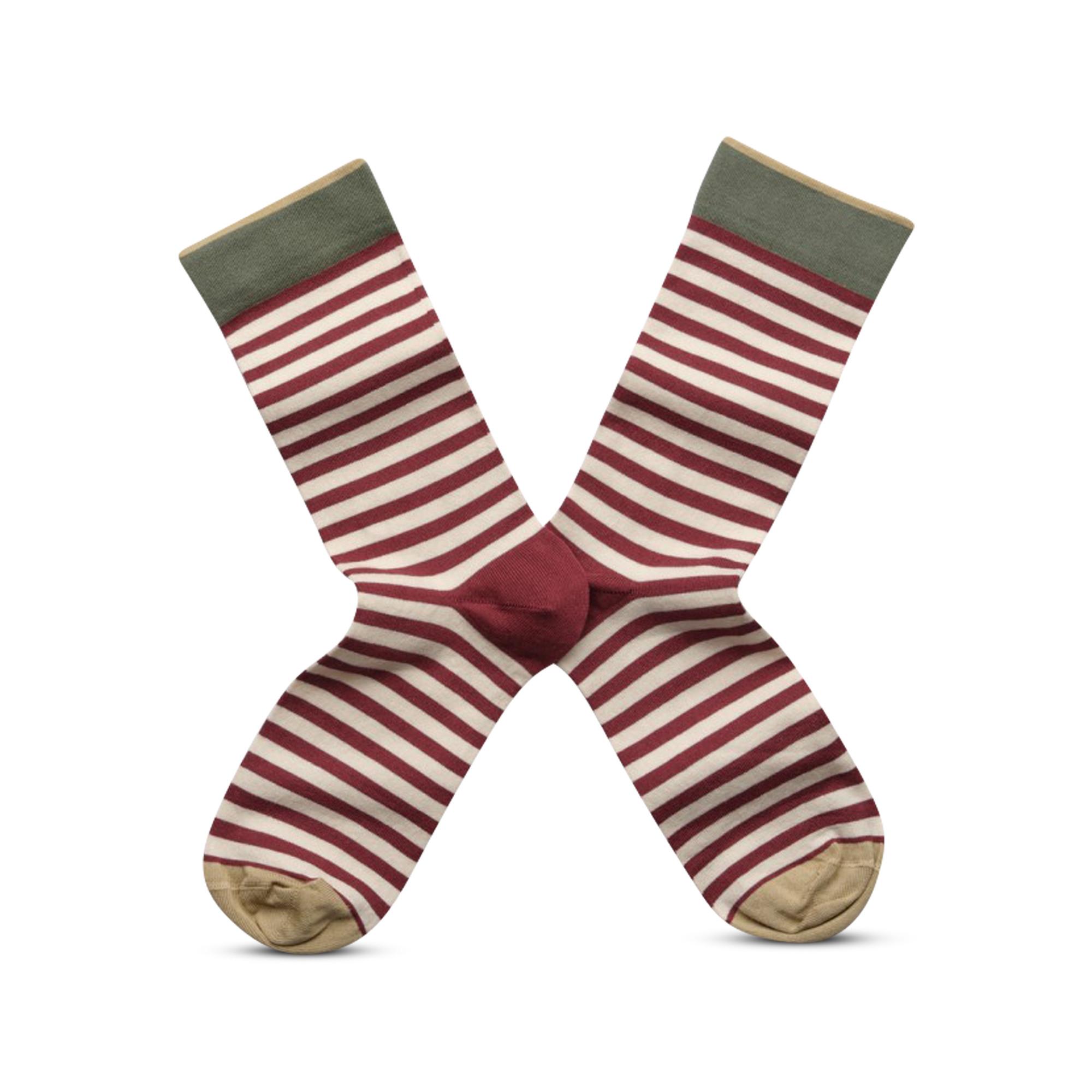 Questi gambaletti mostrano un motivo a righe in borgogna antico e viola su sfondo naturale. Il bordo è in verde cedro, con punta e finitura in verde salvia. Questi calzini a mezza altezza sono realizzati con cotone egiziano fine.