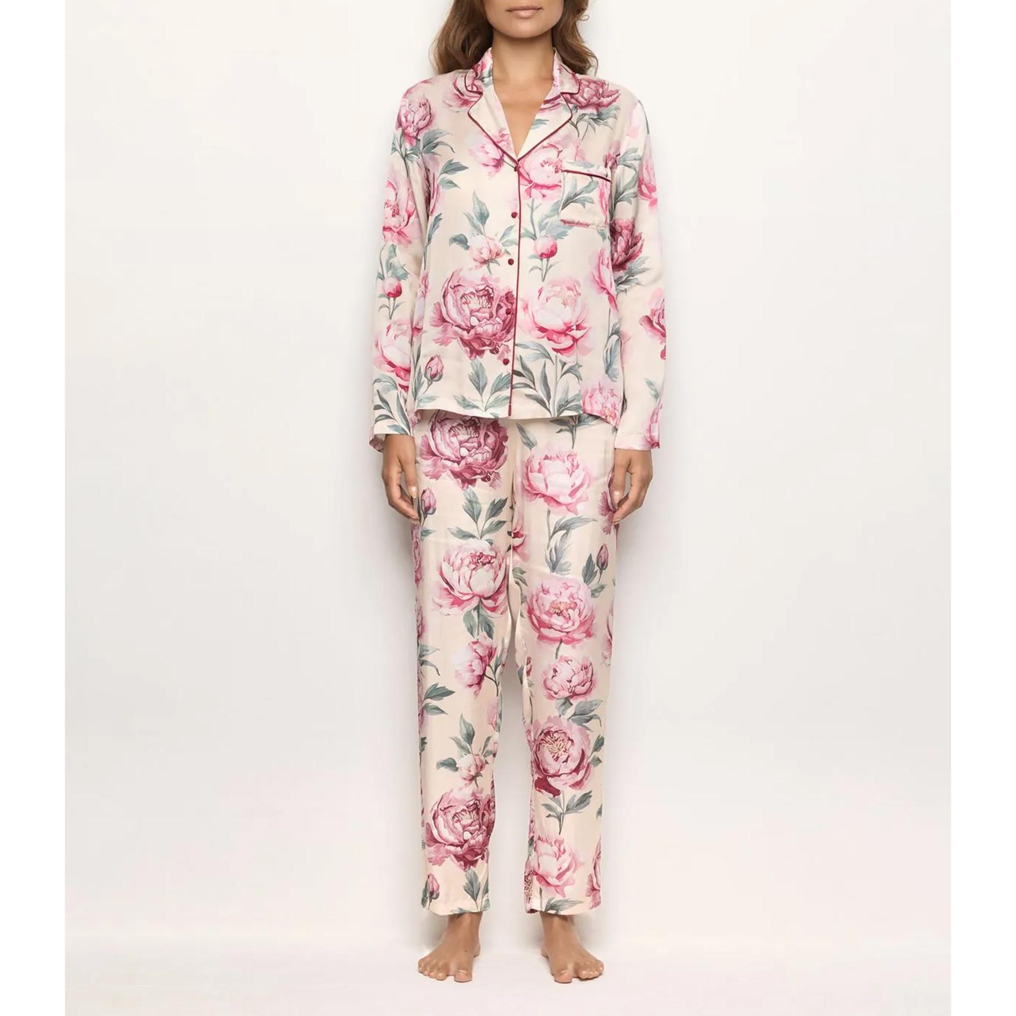 Questo set pigiama presenta una bellissima stampa floreale, offrendo un mix di comfort ed eleganza per l'abbigliamento da casa. La parte superiore è progettata con un colletto classico e una chiusura a bottoni completa, completata da maniche lunghe. I pantaloni abbinati offrono una vestibilità rilassata, garantendo facilità di movimento.