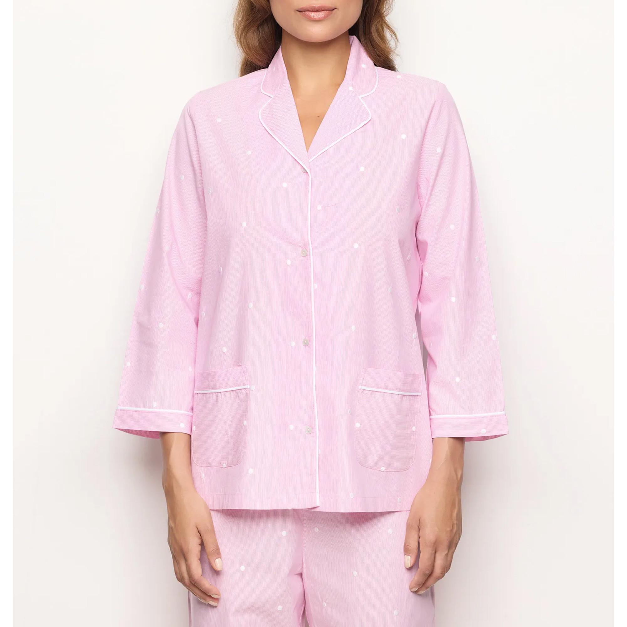 Questa maglia a maniche lunghe presenta un design classico con colletto a revers e chiusura a bottoni su tutta la lunghezza. La maglia è impreziosita da un sottile motivo a pois su uno sfondo a righe, offrendo un'estetica affascinante e rilassata. Dettagli di piping bianco accentuano il colletto, l'abbottonatura e i polsini, aggiungendo un tocco raffinato al capo. Due tasche applicate sul davanti offrono un pratico spazio di archiviazione.