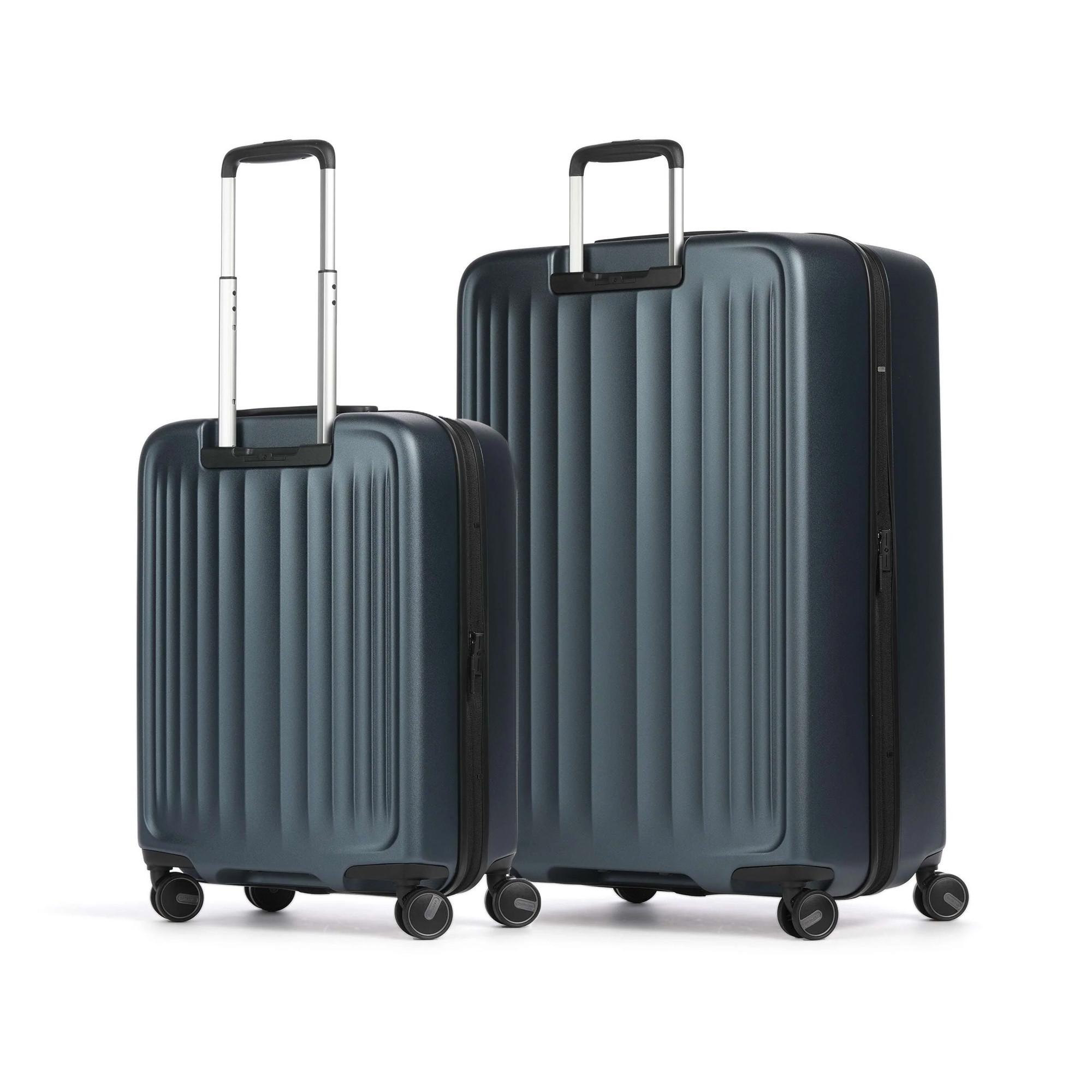 Set composto da 2 valigie: Misura L: Materiale: policarbonato (guscio rigido) Dimensioni: 49 x 77 x 32 cm Peso: 3,9 kg Volume: 111 l Volume espandibile 4 rotelle doppie silenziose, girevoli a 360° Cerniere a due vie con funzione di chiusura a chiave per una maggiore protezione antifurto Lucchetto a combinazione TSA per viaggiare in sicurezza Asta telescopica a due bracci Maniglie di trasporto sulla parte superiore e sui lati Targhetta per l'indirizzo estraibile Fodera interna in poliestere Scomparto principale con divisorio e parete divisoria Cinghie di compressione per fissare saldamente il contenuto Due scomparti con cerniera per una maggiore organizzazione Cabin: Materiale: policarbonato (guscio rigido) Dimensioni: 40 x 55 x 20 cm Peso: 2,6 kg Volume: 40 l Bagaglio a mano Volume espandibile 4 rotelle doppie silenziose, girevoli a 360° Cerniere a due vie con funzione di chiusura a chiave per una maggiore protezione antifurto Lucchetto a combinazione TSA per viaggiare in sicurezza Asta telescopica a due bracci bloccabile Maniglie di trasporto sulla parte superiore e sui lati Targhetta per l'indirizzo estraibile Fodera interna in poliestere Scomparto principale con divisorio e parete divisoria Cinghie di compressione per fissare saldamente il contenuto Due scomparti con cerniera per una maggiore organizzazione