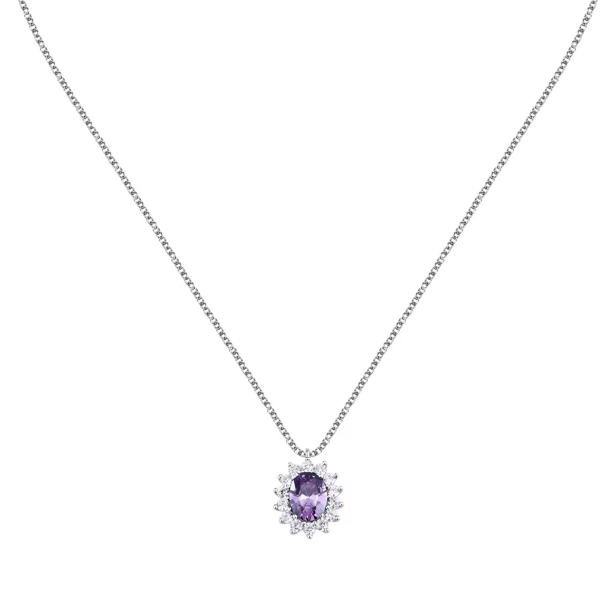La collana Tesori firmata Morellato in argento sostenibile è decorata con scintillanti zirconi bianchi e viola e dona un tocco di stile