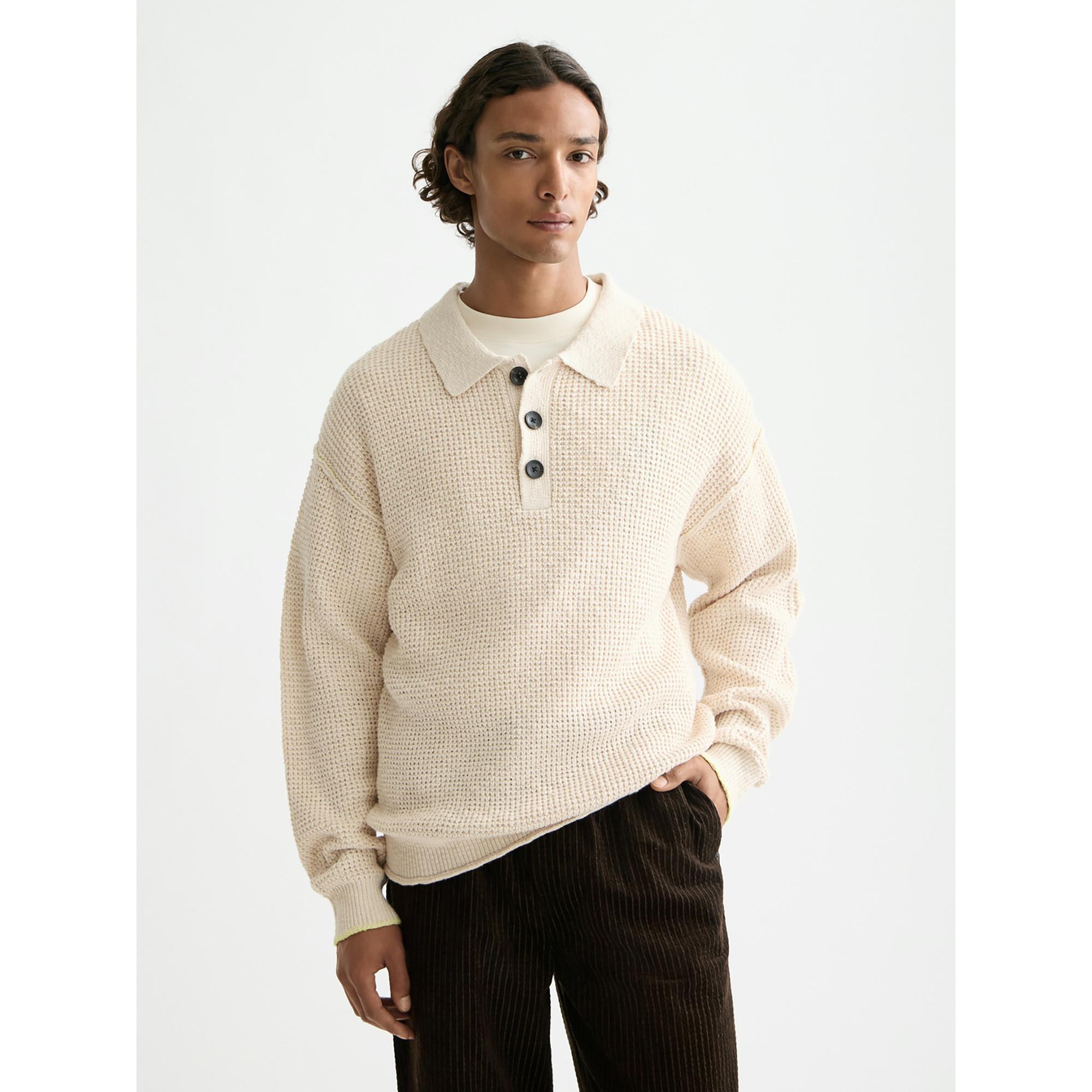 Questo maglione lavorato a maglia presenta un classico colletto polo e un'abbottonatura, offrendo un'estetica intramontabile ma moderna. La maglia testurizzata fornisce uno strato confortevole ed elegante per varie occasioni.