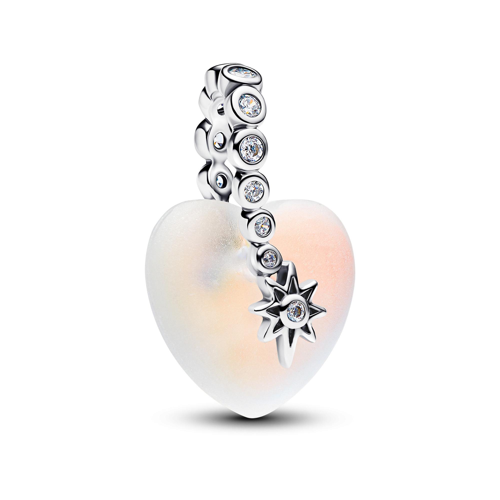 Un cuore in vetro di pietra di luna iridescente incontra una stella cadente. Questo charm in argento sterling e cubic zirconia chiari simboleggia sogni, speranza e infinite possibilità. Lascia che brilli da solo o combinato con altri gioielli significativi.