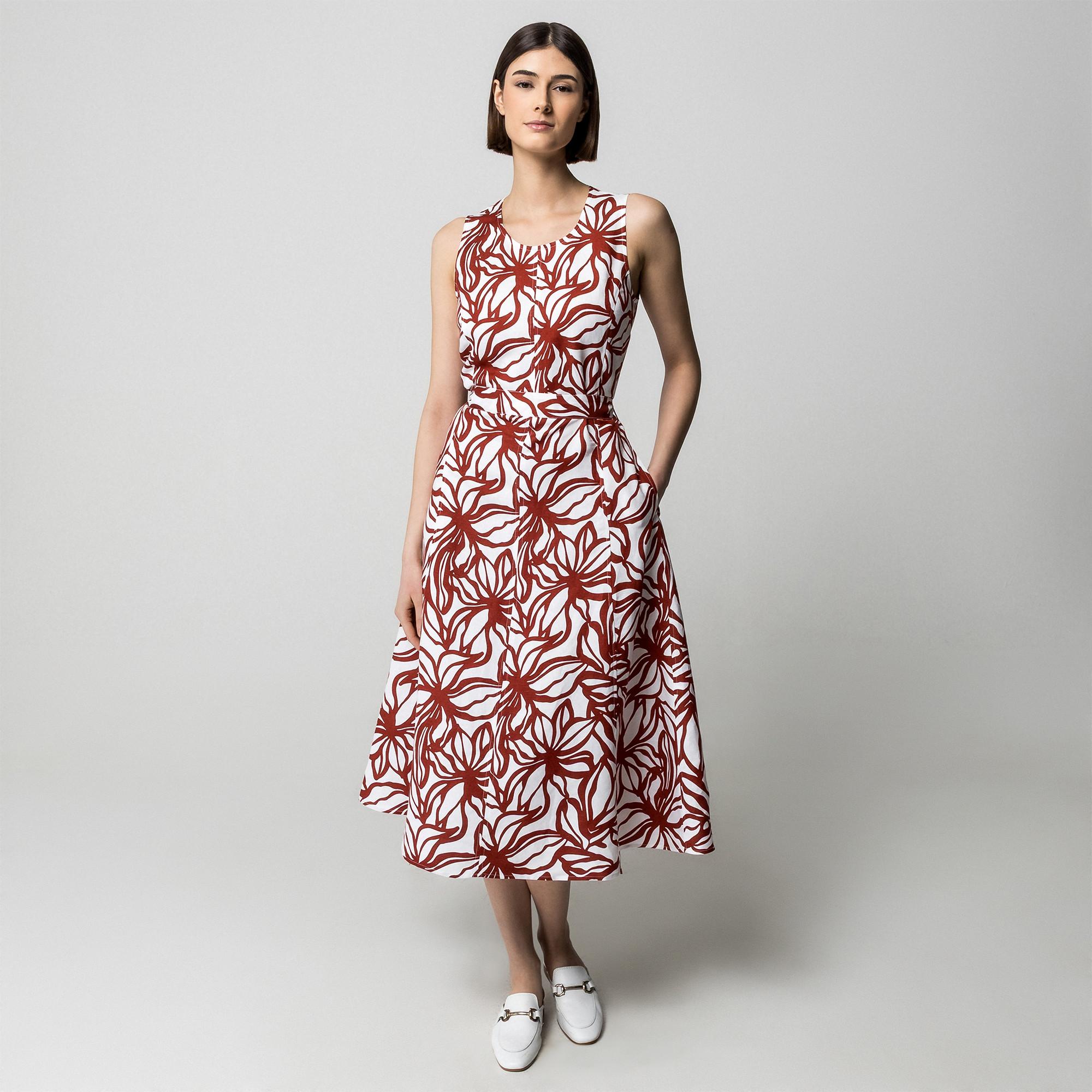 Questo abito midi senza maniche presenta una vivace stampa floreale, offrendo un look fresco ed elegante. L'abito è progettato con una silhouette lusinghiera che si stringe in vita, creando una vestibilità elegante e confortevole. Include pratiche tasche laterali e un dettaglio con laccetti sul retro per un comfort e uno stile regolabili.
