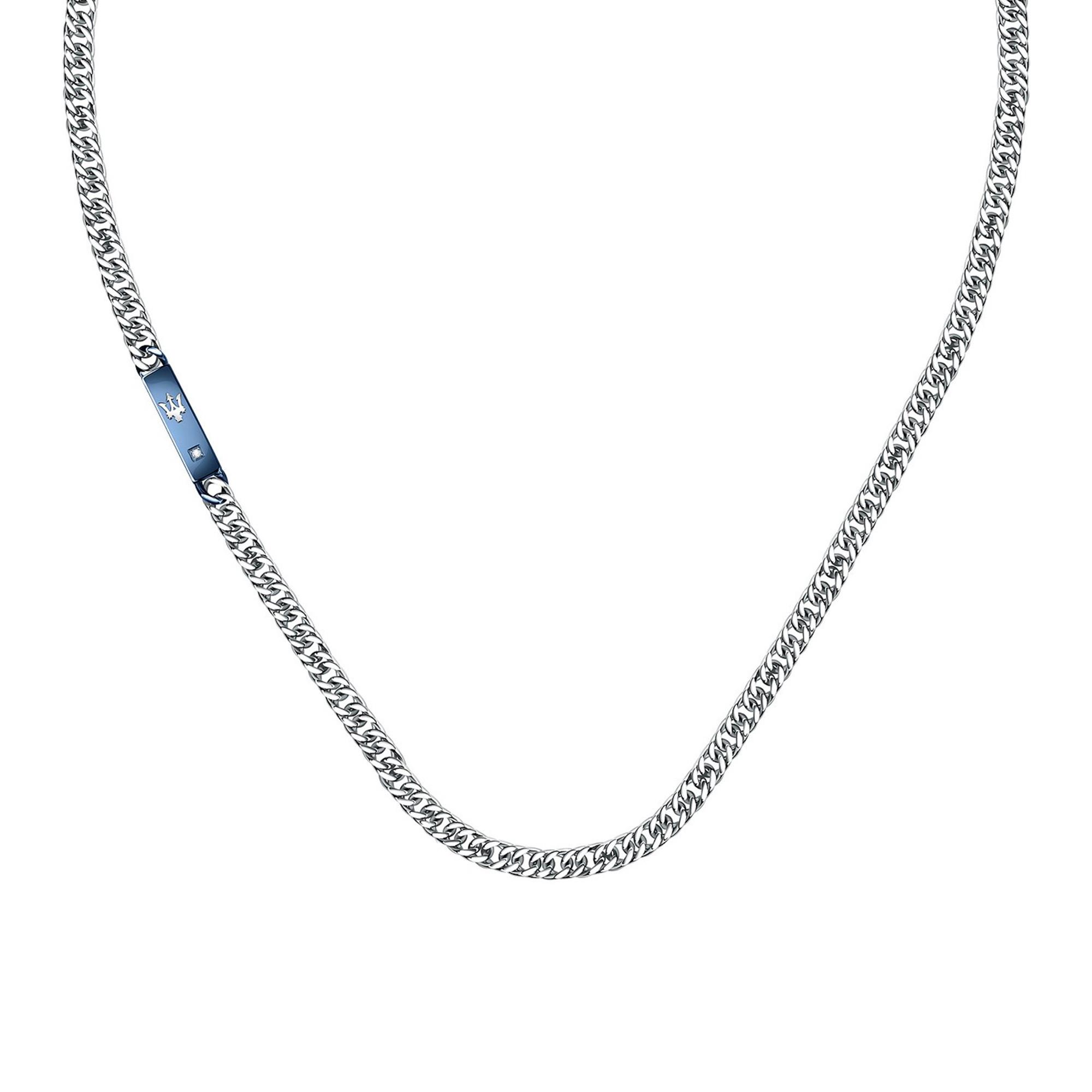 Questa collana da uomo lucida firmata Maserati in acciaio inossidabile rivestito in PVD colpisce per il design argentato e intramontabile. Il dettaglio distintivo in piastrine blu scintillanti con logo a tridente e piccolo strass rende la catena lunga 55 cm una dichiarazione di stile. Acciaio inossidabile rivestito in PVD di alta qualità Logo Maserati sorprendente con strass Chiusura a moschettone sicura