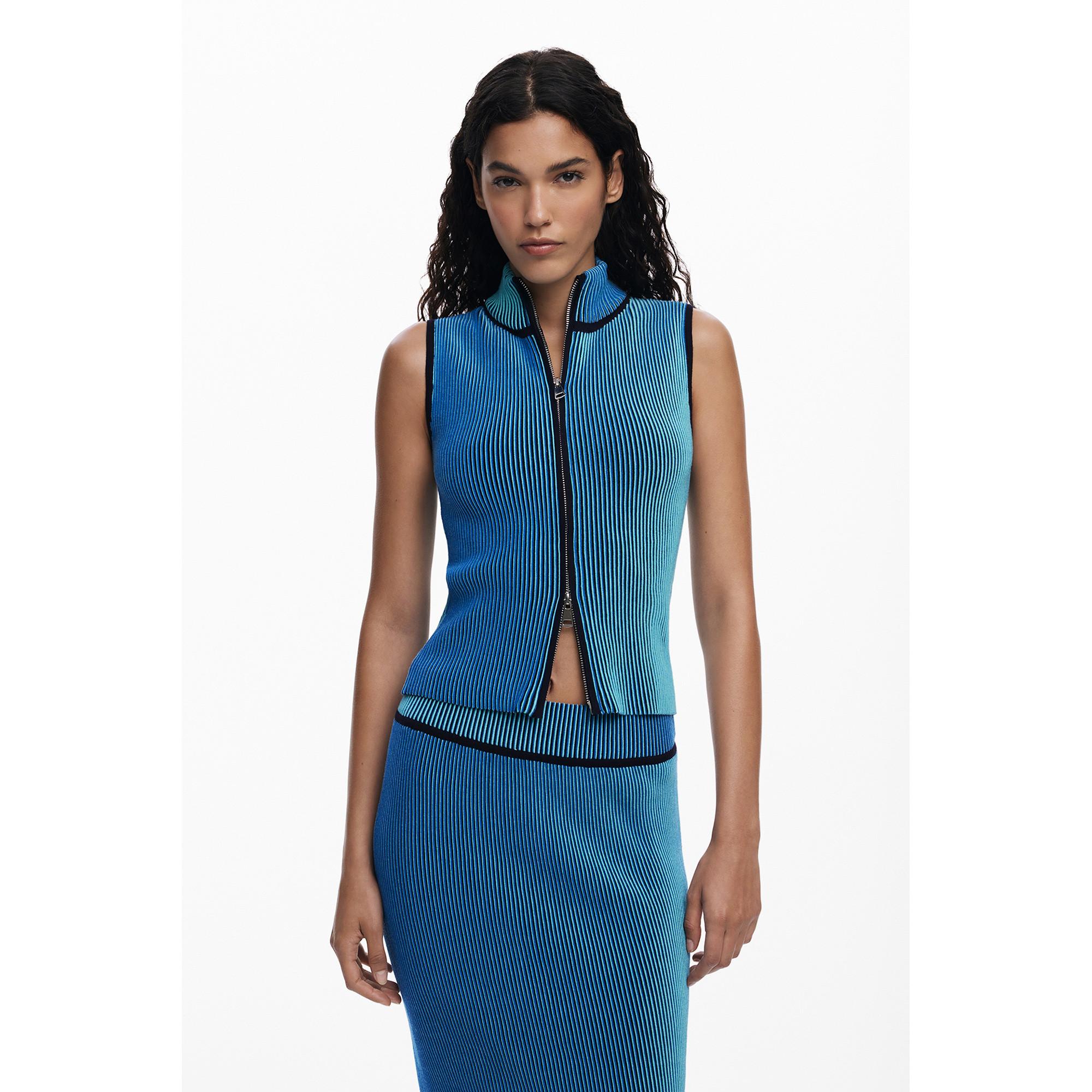 La maglia in maglia aderente di Desigual presenta un collo in piedi, una mezza zip frontale e un motivo a righe verticali in rilievo. Il taglio senza maniche dona leggerezza e versatilità. Un capo essenziale creativo, strutturato e ricco di carattere.