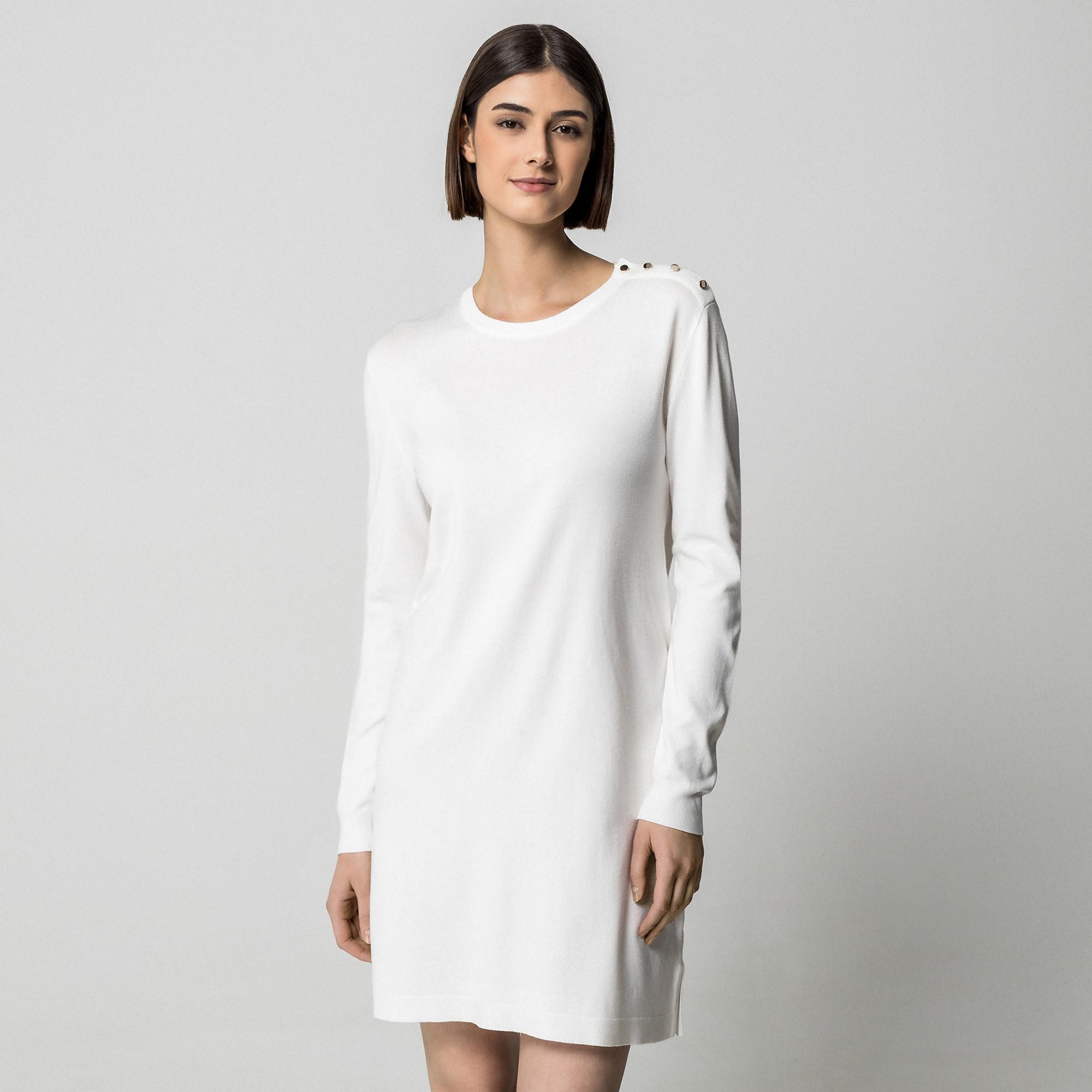 Questo abito in maglia offre un look intramontabile e alla moda. Il design presenta una classica scollatura rotonda e maniche lunghe, rendendolo adatto a diverse occasioni. Bottoni decorativi sulla spalla aggiungono un tocco di eleganza al capo.