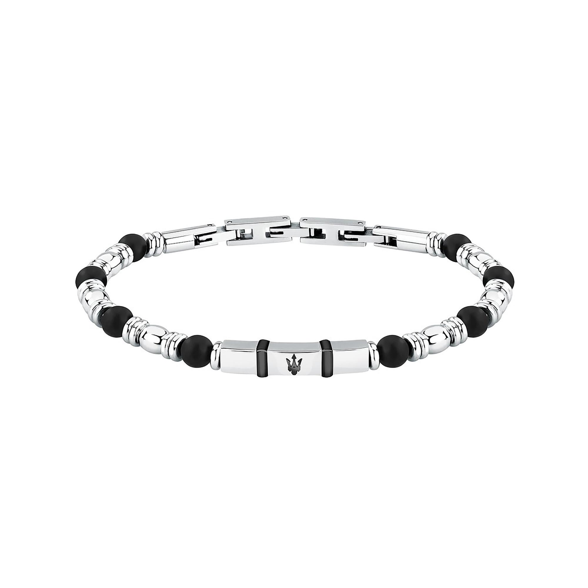 Questo elegante bracciale da uomo firmato Maserati combina l'acciaio inossidabile lucido con dettagli in agata nera per un look dinamico bicolore. Il bracciale lungo 19 cm con chiusura a clip è arricchito dalla maglia rettangolare centrale con il logo a tridente argentato. Acciaio inossidabile con superficie lucida Sfere di agata nera come sobrio accento di colore Comoda chiusura a scatto