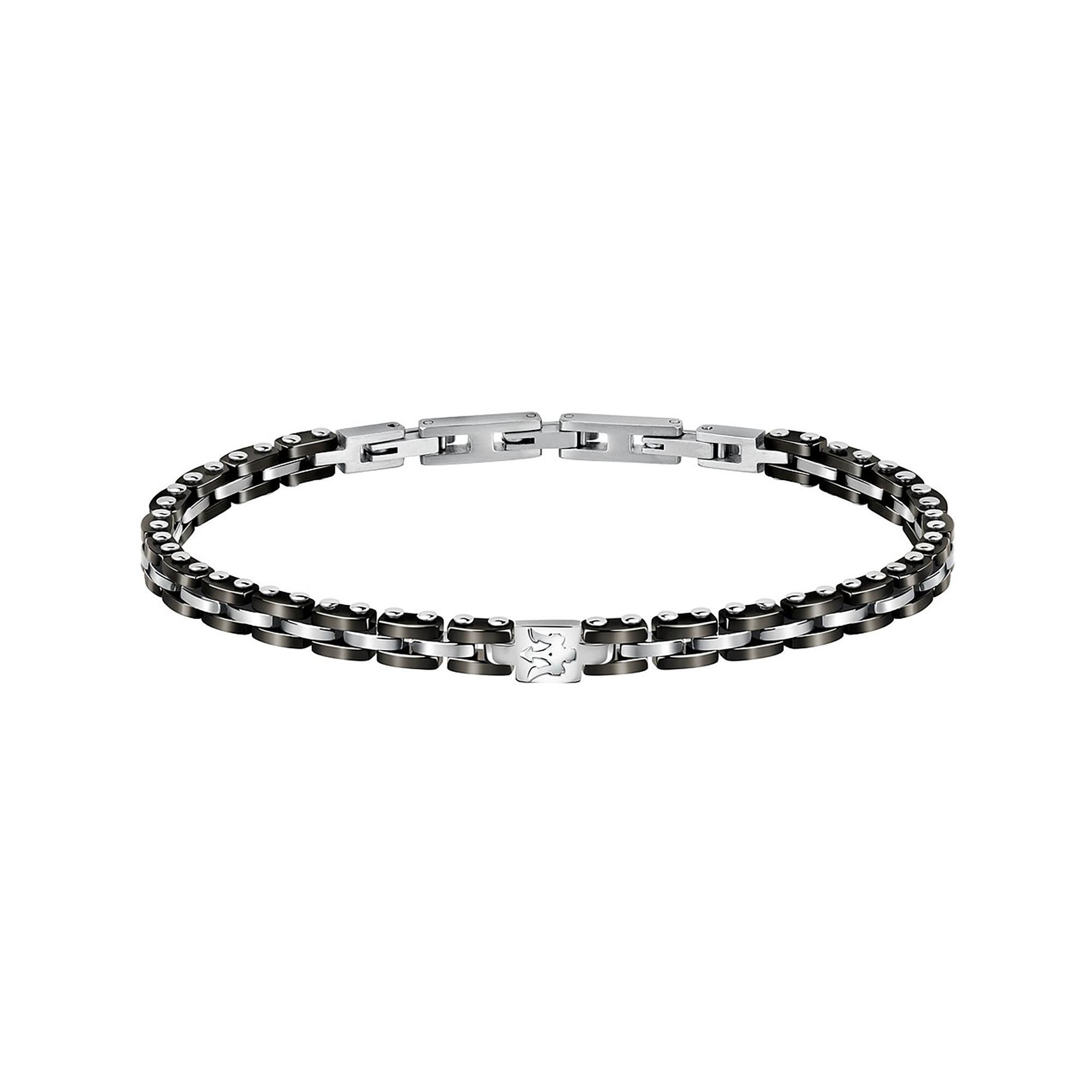 Questo bracciale da uomo firmato Maserati colpisce per il moderno look bicolore in acciaio inossidabile nero e argento. Le maglie centrali e la chiusura a scatto brillano d'argento