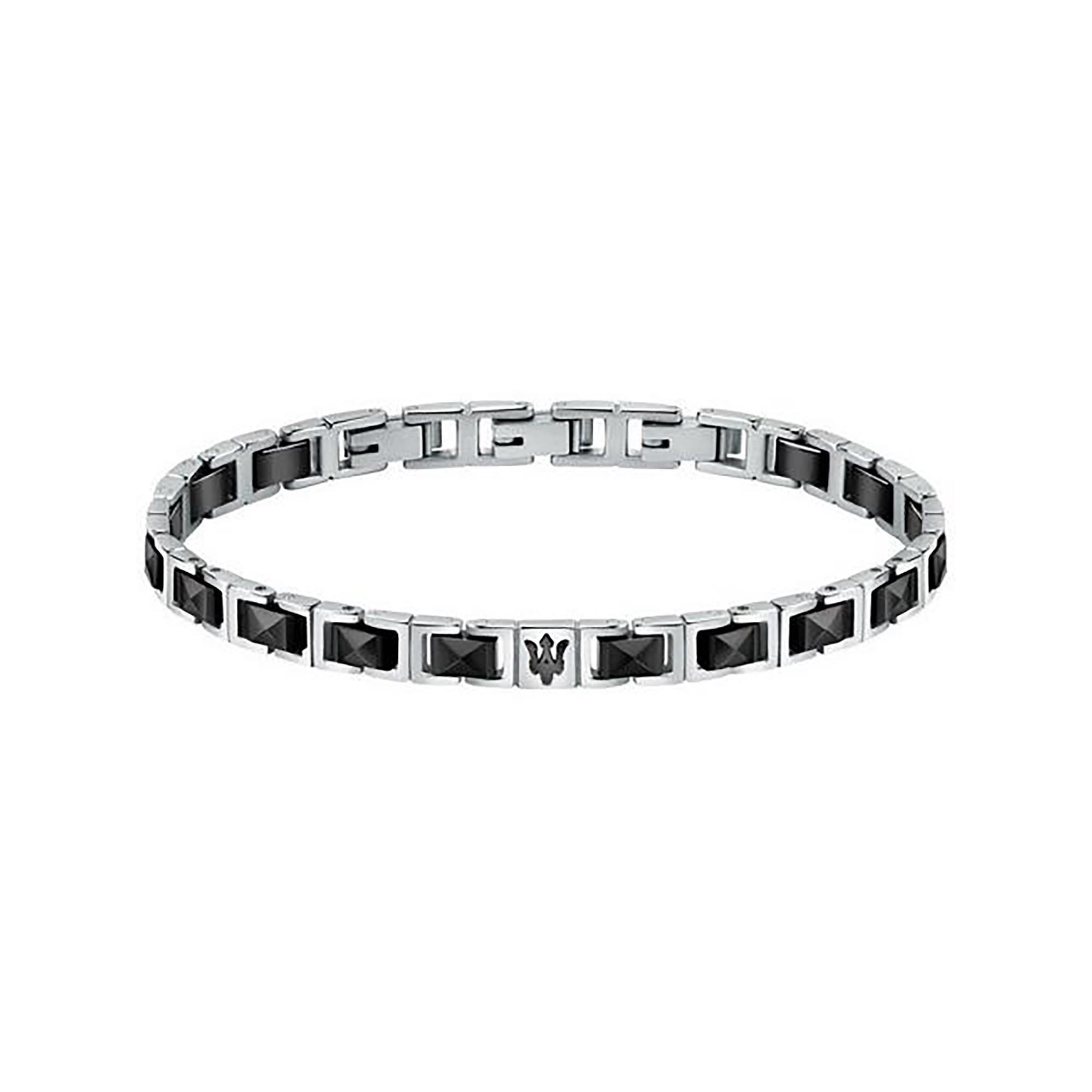 Questo bracciale da uomo firmato Maserati colpisce per la combinazione di acciaio inossidabile argentato e ceramica nera. Le cornici lucide accentuano i quadrati centrali