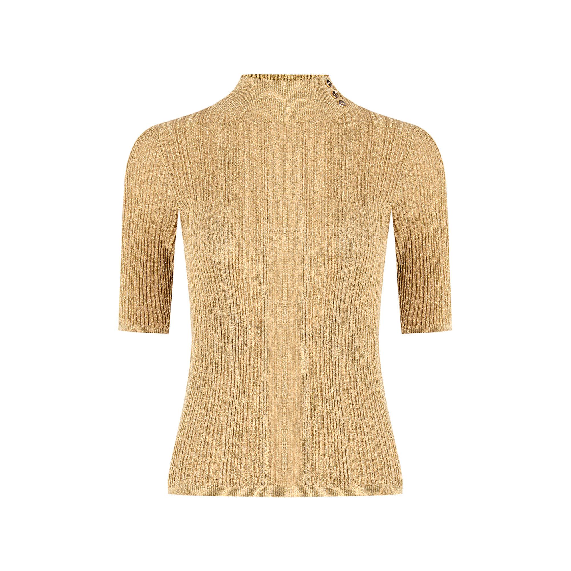 Questa maglia a maniche corte presenta una lavorazione a coste e filati brillanti. Il collo alto con bottoni decorativi aggiunge un dettaglio elegante, ideale per abbinamenti sofisticati.