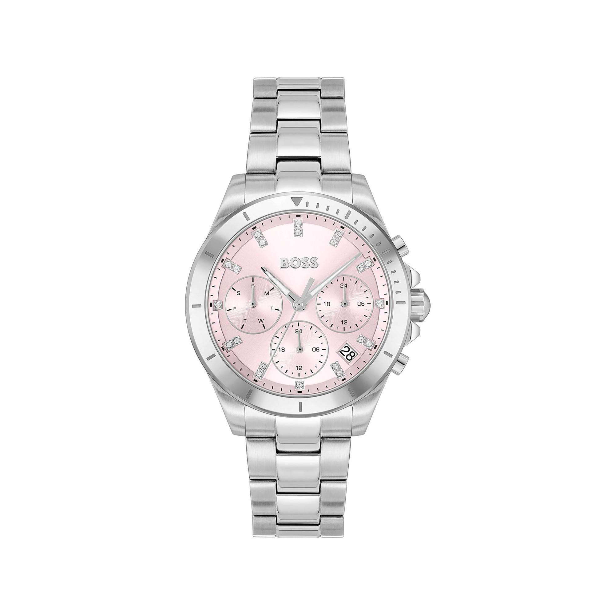 La montre pour femme Boss Alley allie design sport-chic et technologie précise. Elle dispose d’un boîtier en acier inoxydable de 36 mm, d’un bracelet à maillons assorti, d’un cadran rose avec affichage de la date et d’un mouvement à quartz Miyota fiable.