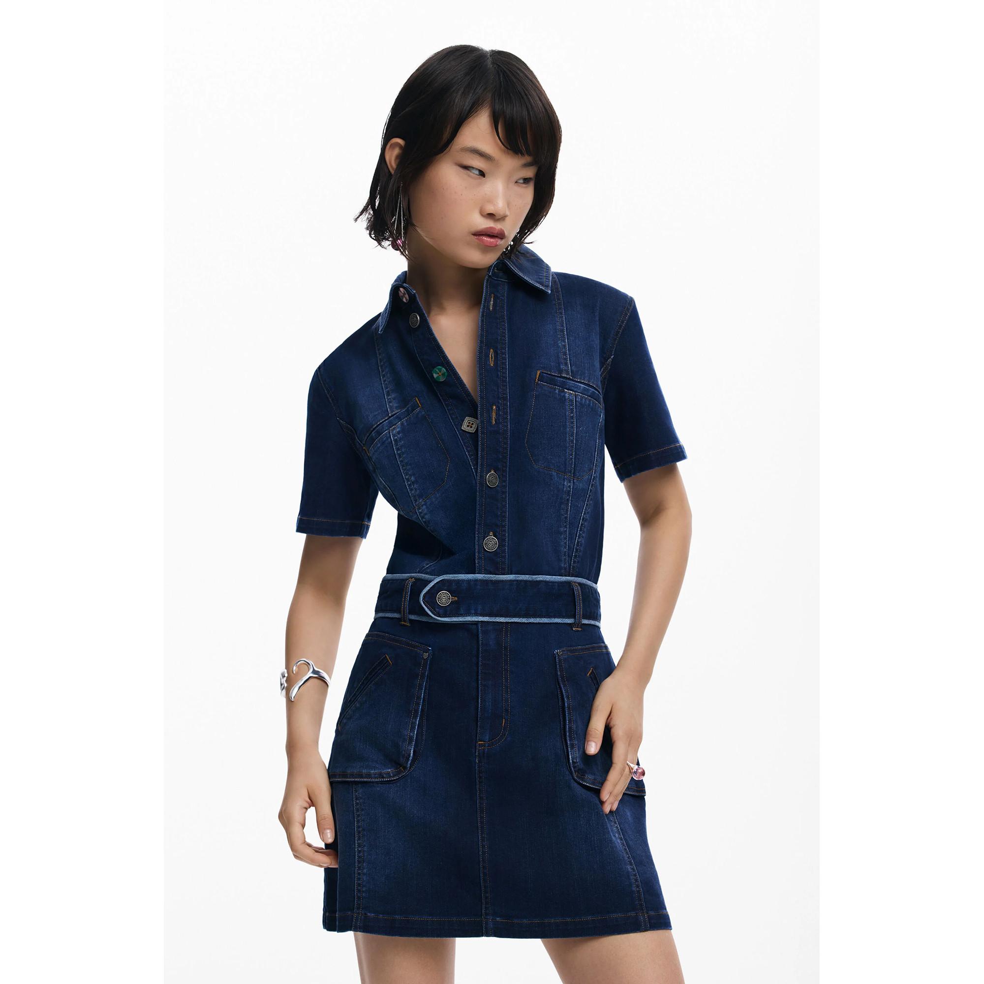 Questo abito corto in denim colpisce per la linea dritta, i dettagli a contrasto e la cintura con bottoni. Il colletto a camicia, le maniche corte e le quattro tasche frontali creano un look utility casual. Realizzato in cotone BCI – alla moda e sostenibile.