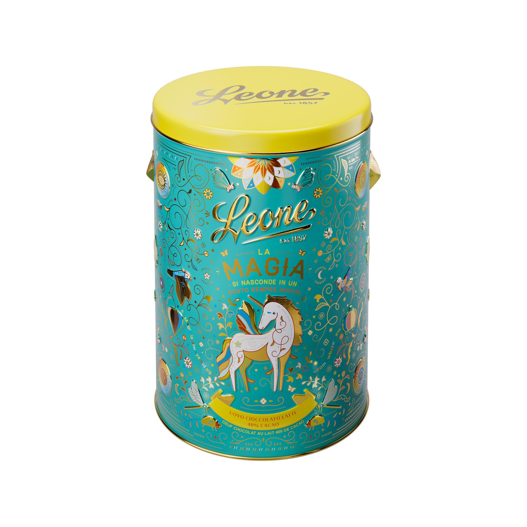 "L'uovo di Pasqua Leone al cioccolato al latte con il 40% di cacao è sinonimo di puro piacere e dolcezza delicatamente fondente. Confezionato in una scatola di metallo illustrata con cura della collezione ""Little Stories of Happiness"", combina gusto di alta qualità e un'idea regalo speciale. L'uovo di Pasqua da 300 g è realizzato secondo un'innovativa ricetta Leone e convince con aromi finemente coordinati. All'interno si nasconde anche una piccola sorpresa che completa perfettamente l'esperienza. Dal 1857 Pastiglie Leone è sinonimo di artigianato tradizionale, ingredienti selezionati e una varietà di specialità dolci. "