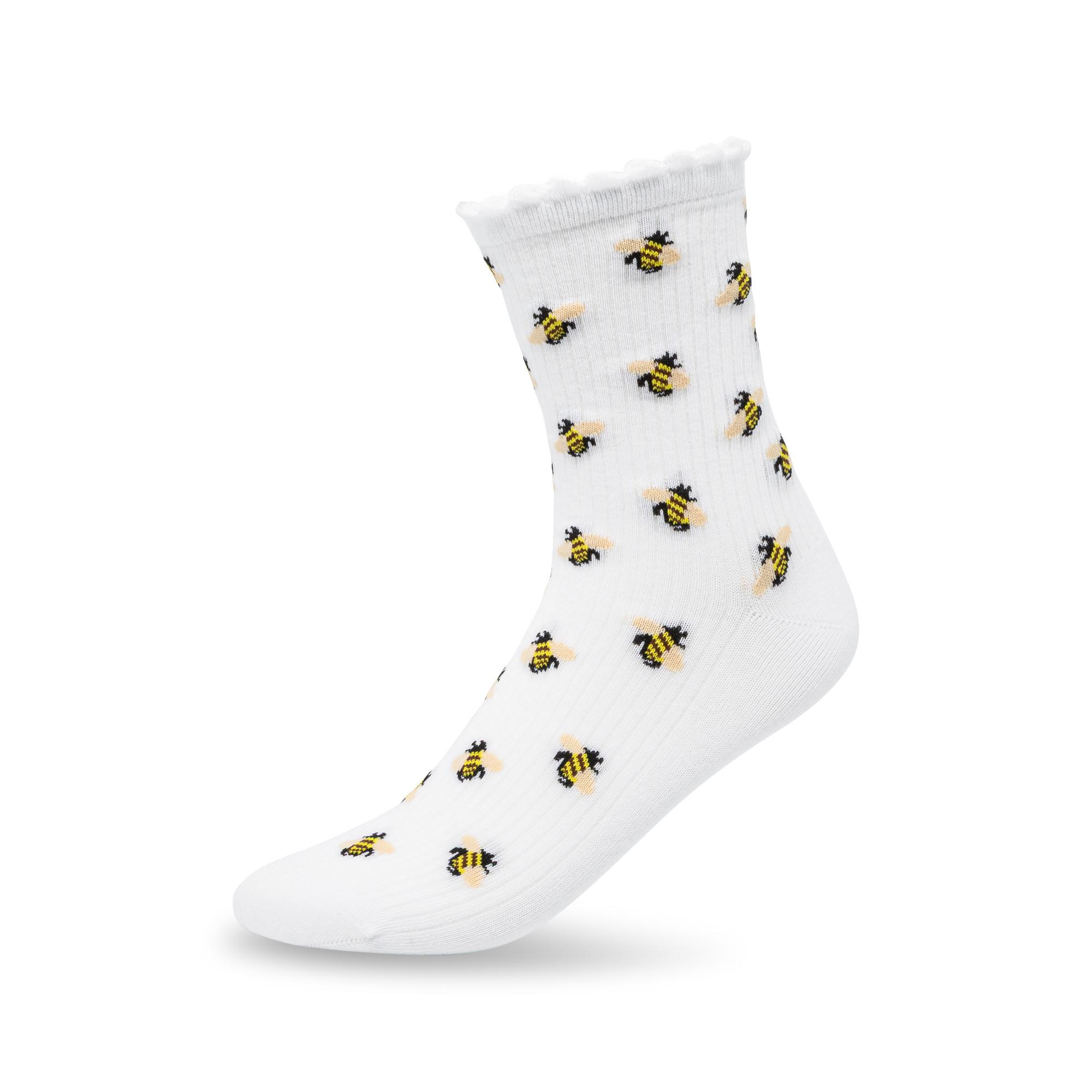 Queste calze presentano un giocoso motivo a api, aggiungendo un tocco di fascino a qualsiasi outfit. Il design include un bordo arricciato per una finitura delicata ed elegante.