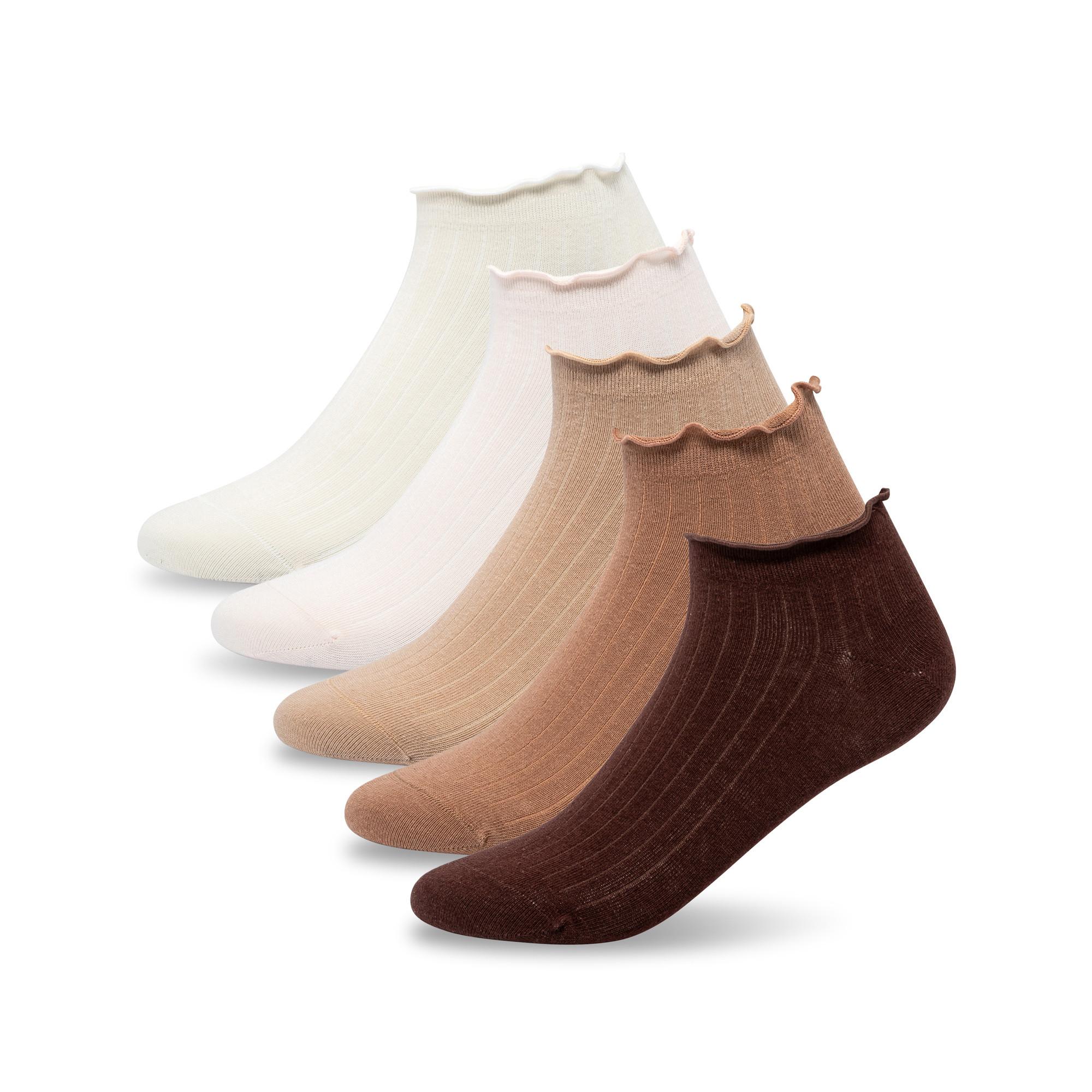 Questa confezione da 5 paia di calze sneaker offre un mix di comfort e stile. Ogni paio presenta un delicato bordo arricciato, aggiungendo un dettaglio affascinante all'abbigliamento quotidiano. Il design a costine assicura una vestibilità aderente e un'estetica classica.