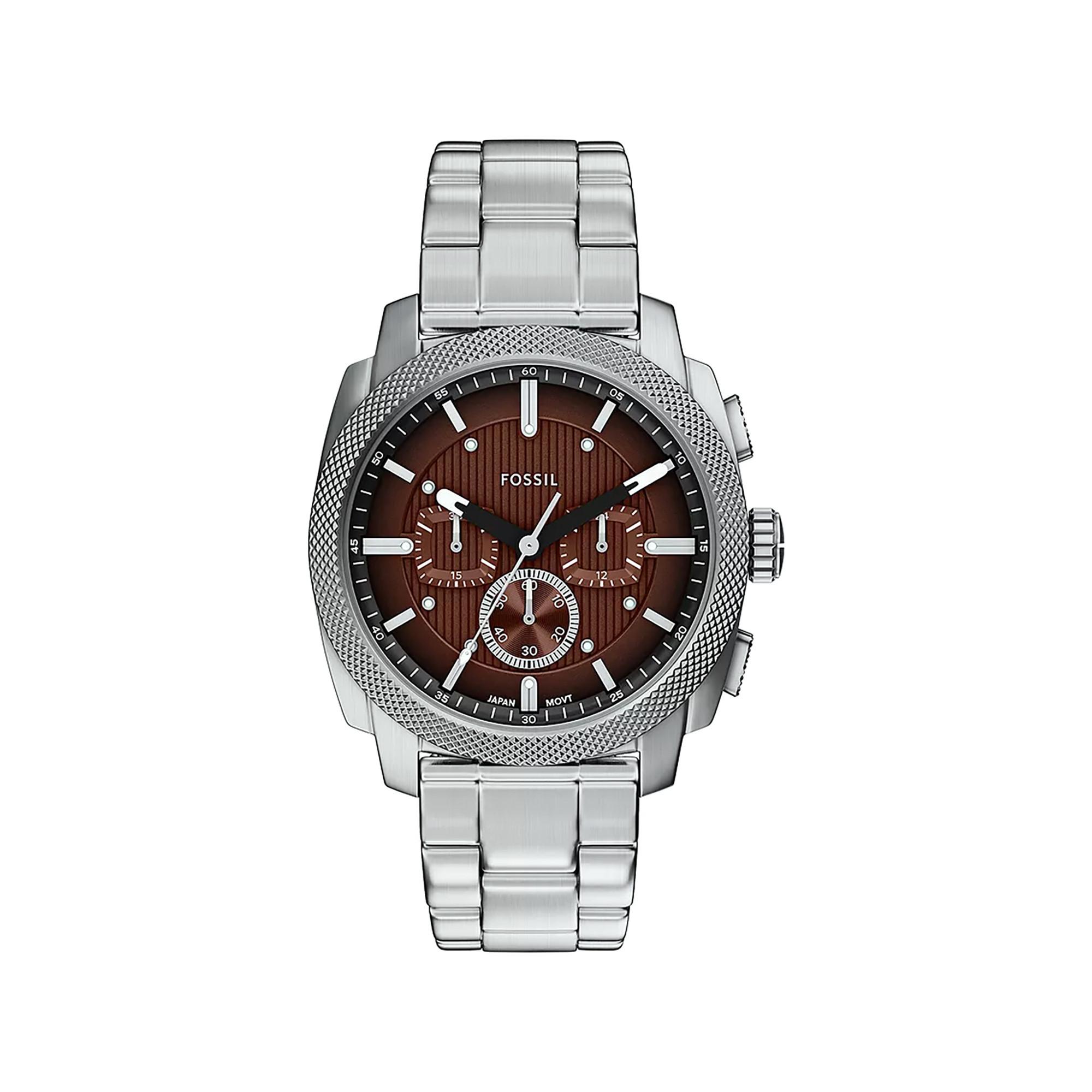 L’orologio Machine Chronograph si distingue per la lunetta zigrinata ed è ispirato alle classiche macchine americane. La grande cassa da 44 mm con vetro minerale e quadrante marrone scuro con dettagli strutturati emana una forte presenza maschile, mentre il movimento al quarzo preciso con funzione cronografo e il resistente cinturino in acciaio completano perfettamente lo stile industriale.
