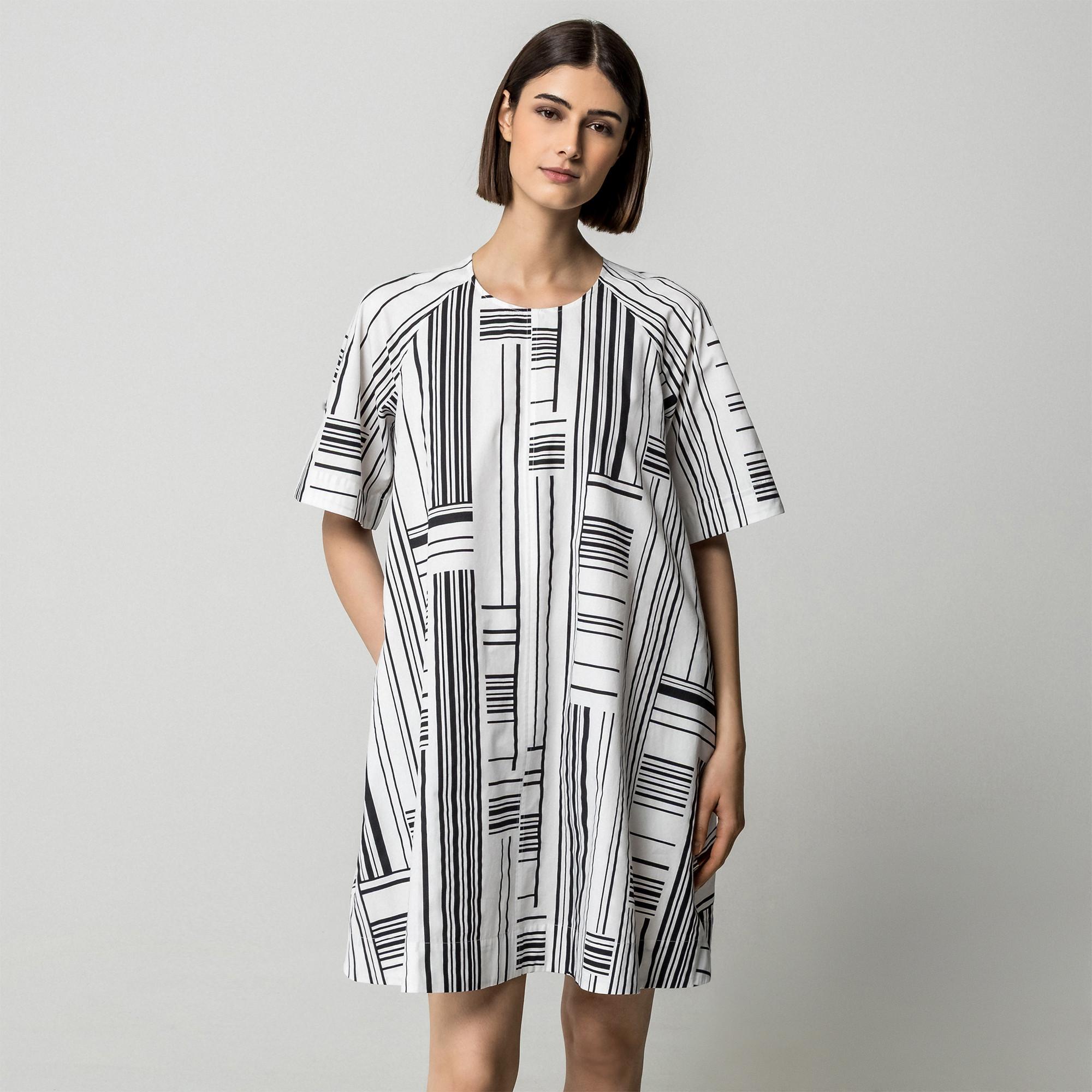 Questo abito casual presenta un sorprendente motivo a righe astratte, offrendo una silhouette moderna e rilassata. Il design include uno scollo rotondo e maniche corte, rendendolo un'aggiunta versatile a qualsiasi guardaroba. L'abito è tagliato per il comfort e la facilità di movimento, perfetto per l'uso quotidiano.