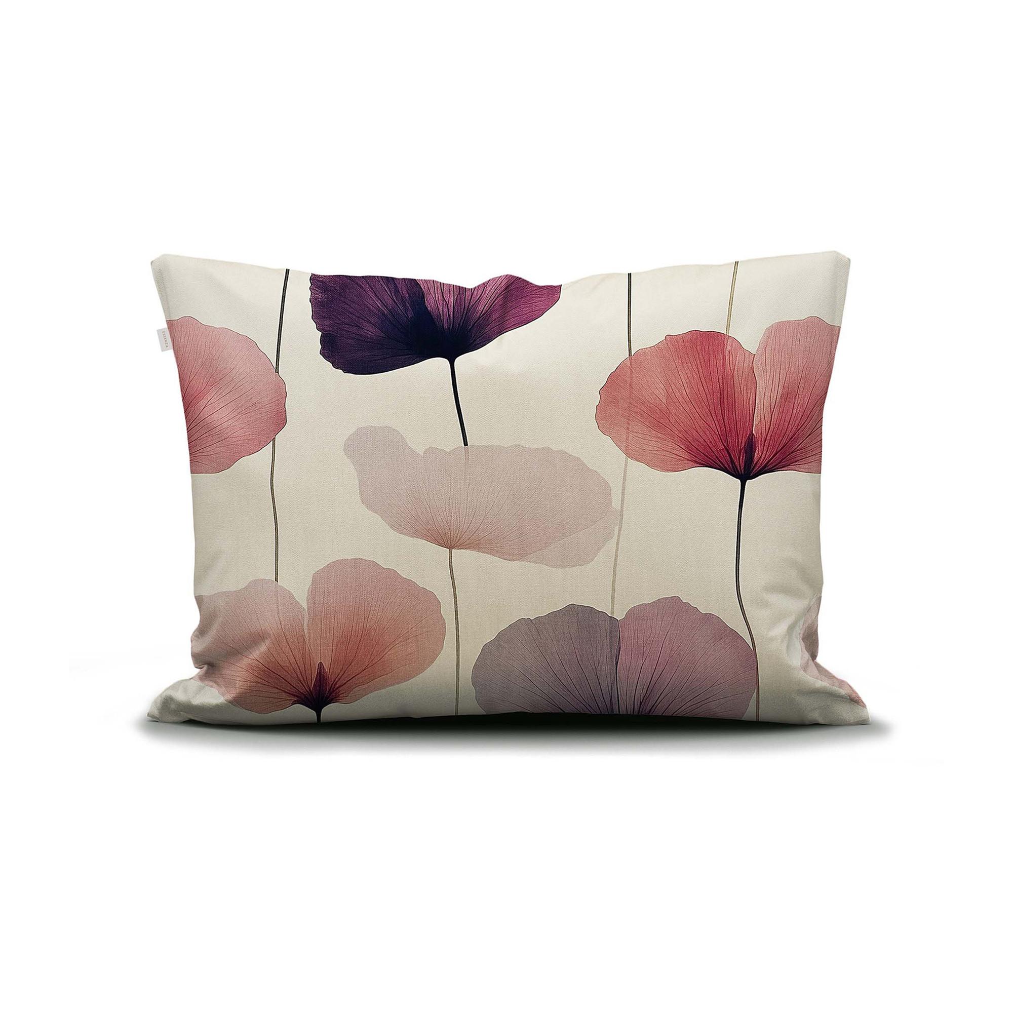 La federa Essenza Kati mostra grandi petali a forma di ventaglio, ciascuno su un lungo stelo sottile. I fiori trasparenti, quasi traslucidi, con sfumature sottili e delicati effetti cromatici, si fondono in un quadro d'insieme tranquillo e ritmico. La fodera è realizzata in raso di cotone al 100%, un materiale liscio, morbido e sobriamente lucido, traspirante e piacevolmente morbido sulla pelle.
