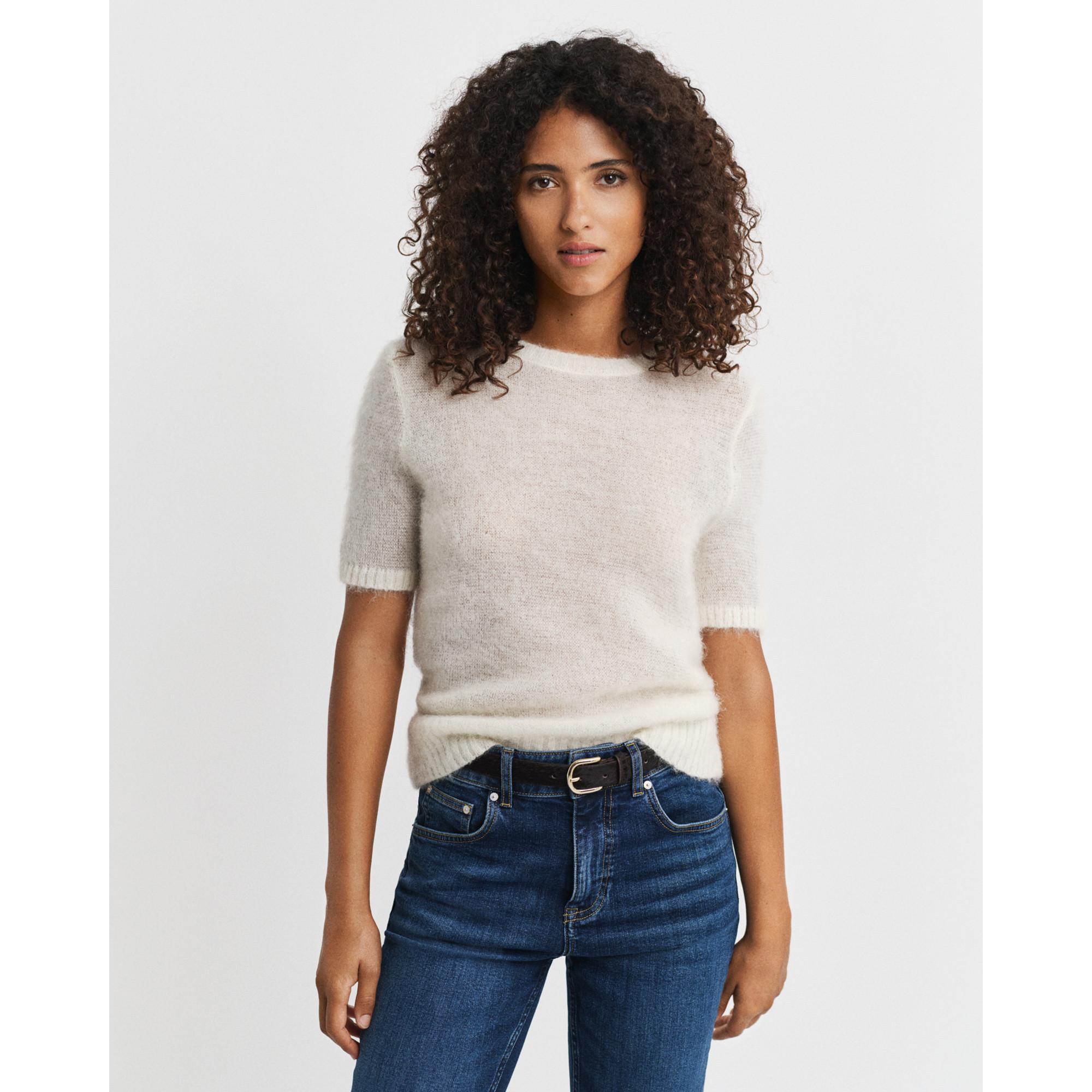 Questo maglione a maniche corte in misto mohair conquista con la sua struttura leggera e soffice e lo scollo rotondo elegante. La vestibilità rilassata lo rende ideale da indossare a strati o da solo nelle giornate miti. Un capo essenziale e raffinato per la mezza stagione – morbido, di qualità e versatile.