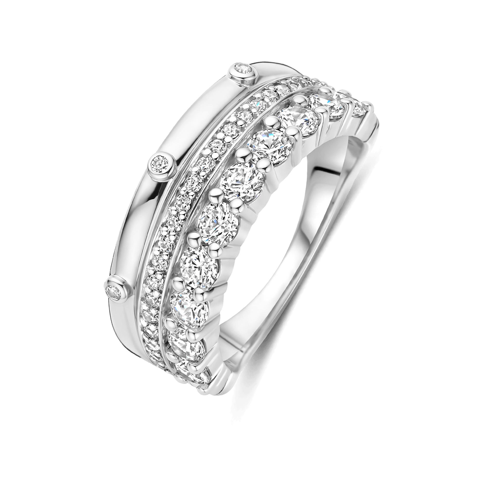 L’anello TI SENTO, realizzato in argento sterling 925 con una luminosa placcatura al platino, presenta un raffinato gioco di tre livelli: una fila centrale di zirconi bianchi incastonati a griffe, affiancata da dettagli pavé e da eleganti accenti a castone. La composizione pulita dona un’eleganza moderna e delicata, perfetta per aggiungere un lusso discreto sia ogni giorno che nelle occasioni serali.