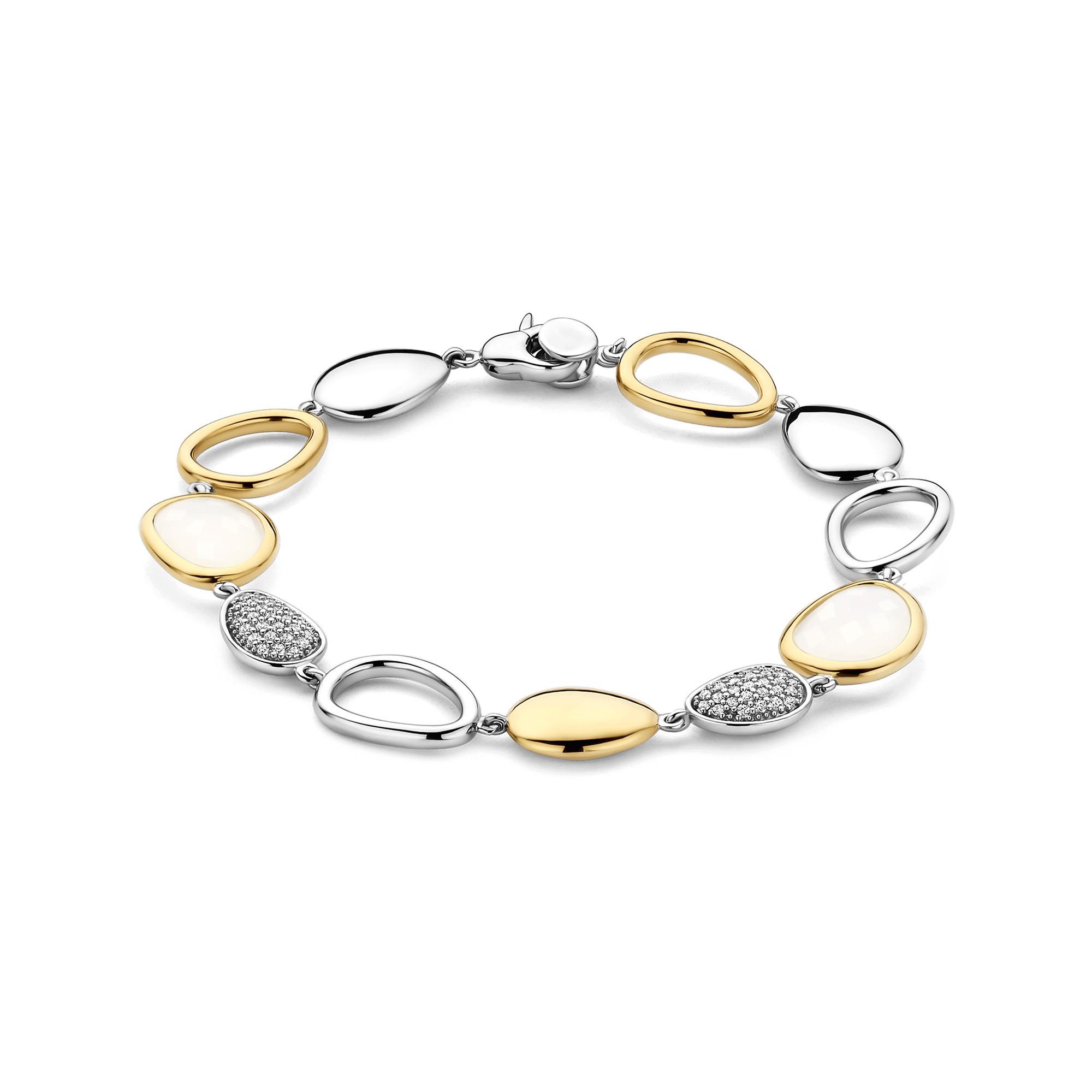 Il bracciale TI SENTO in argento sterling 925 unisce eleganza scultorea a un design fluido con charm a forma di ciottolo: una pietra bianco-latte taglio fantasia incorniciata in oro giallo, un ciottolo lucido placcato oro, dischi pavé con zirconi scintillanti e dettagli aperti placcati platino per un effetto arioso. Il gioco di luce, colore e texture avvolge il polso con immediata raffinatezza, da solo o abbinato a bracciali minimalisti.