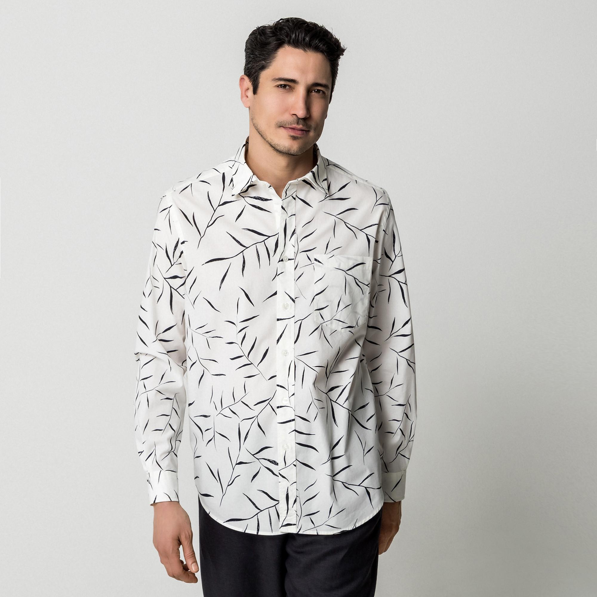 Questa camicia a maniche lunghe presenta una distintiva stampa a foglie, offrendo un look elegante e contemporaneo. È progettata con un classico colletto a punta e un'abbottonatura completa per una finitura raffinata. Una singola tasca sul petto aggiunge un dettaglio funzionale al design.