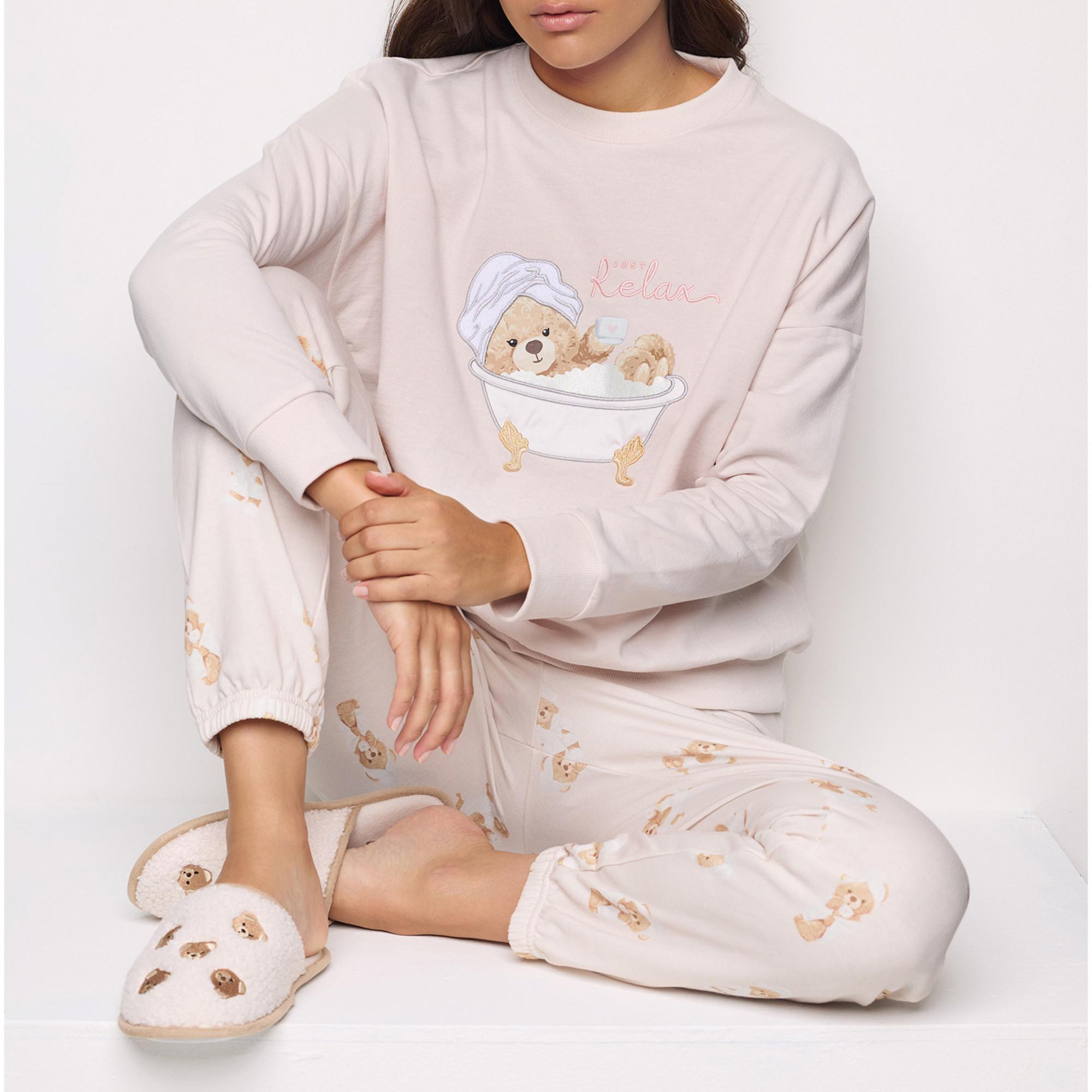 Questo set pigiama offre comfort e un design giocoso, perfetto per rilassarsi a casa. La parte superiore presenta una graziosa stampa di orsi, mentre i pantaloni sono decorati con un motivo orso all-over.