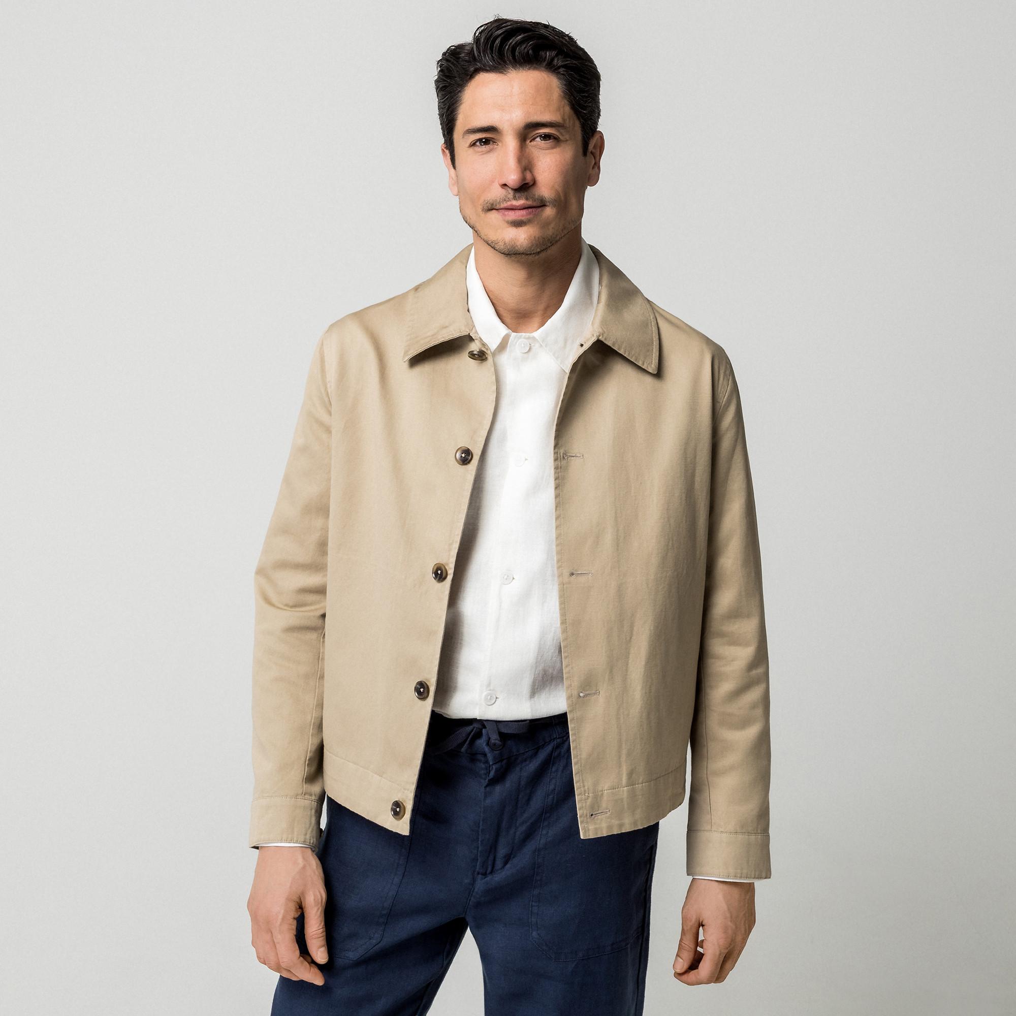 Questo cappotto doppiopetto offre un look classico e raffinato. Realizzato con una miscela di cotone e lino, garantisce comfort e stile per diverse occasioni.