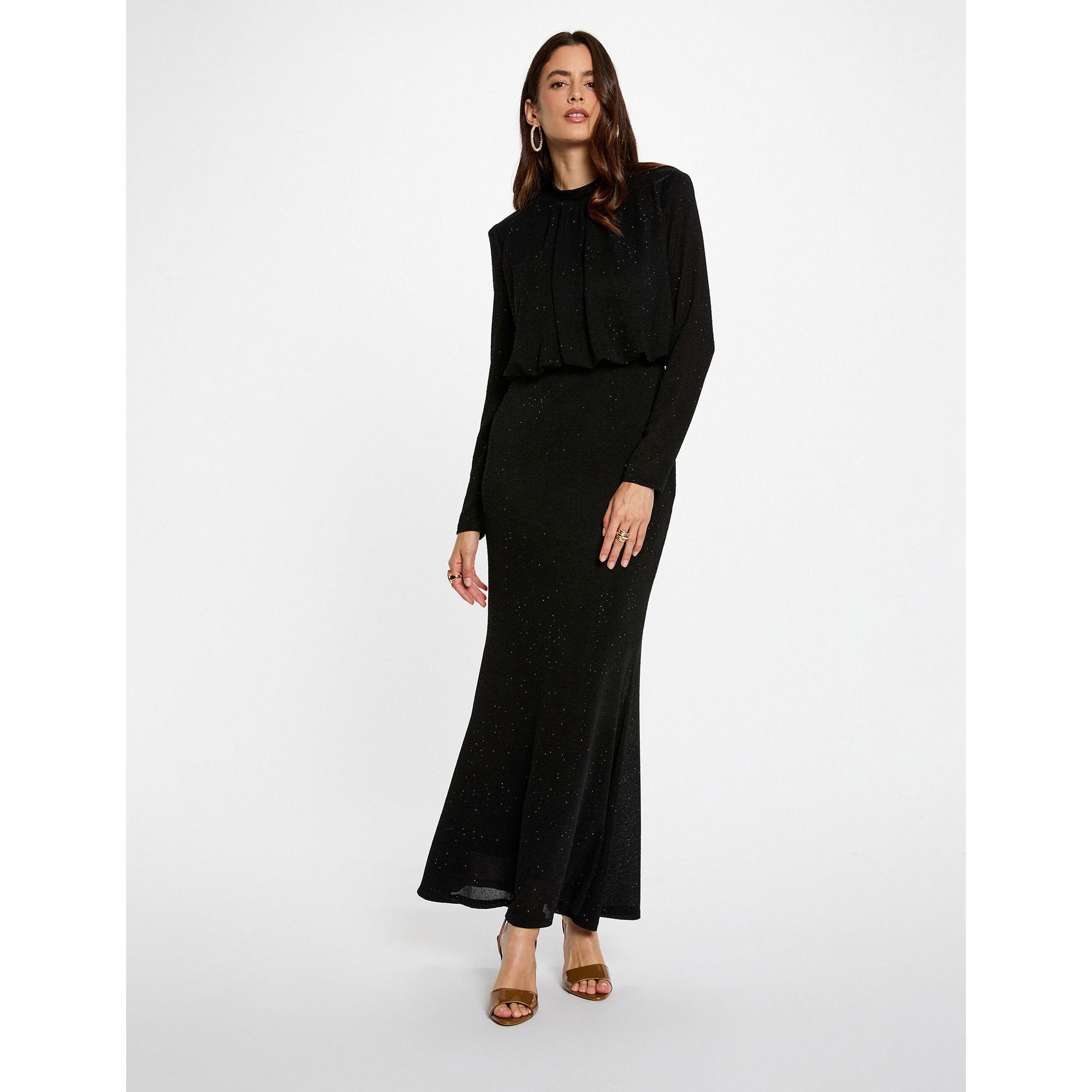 Questo abito in maglia presenta una finitura brillante e un collo alto dritto. Il taglio svasato e la lunghezza maxi creano una silhouette elegante con un tocco moderno. È ideale per eventi speciali o look serali raffinati.