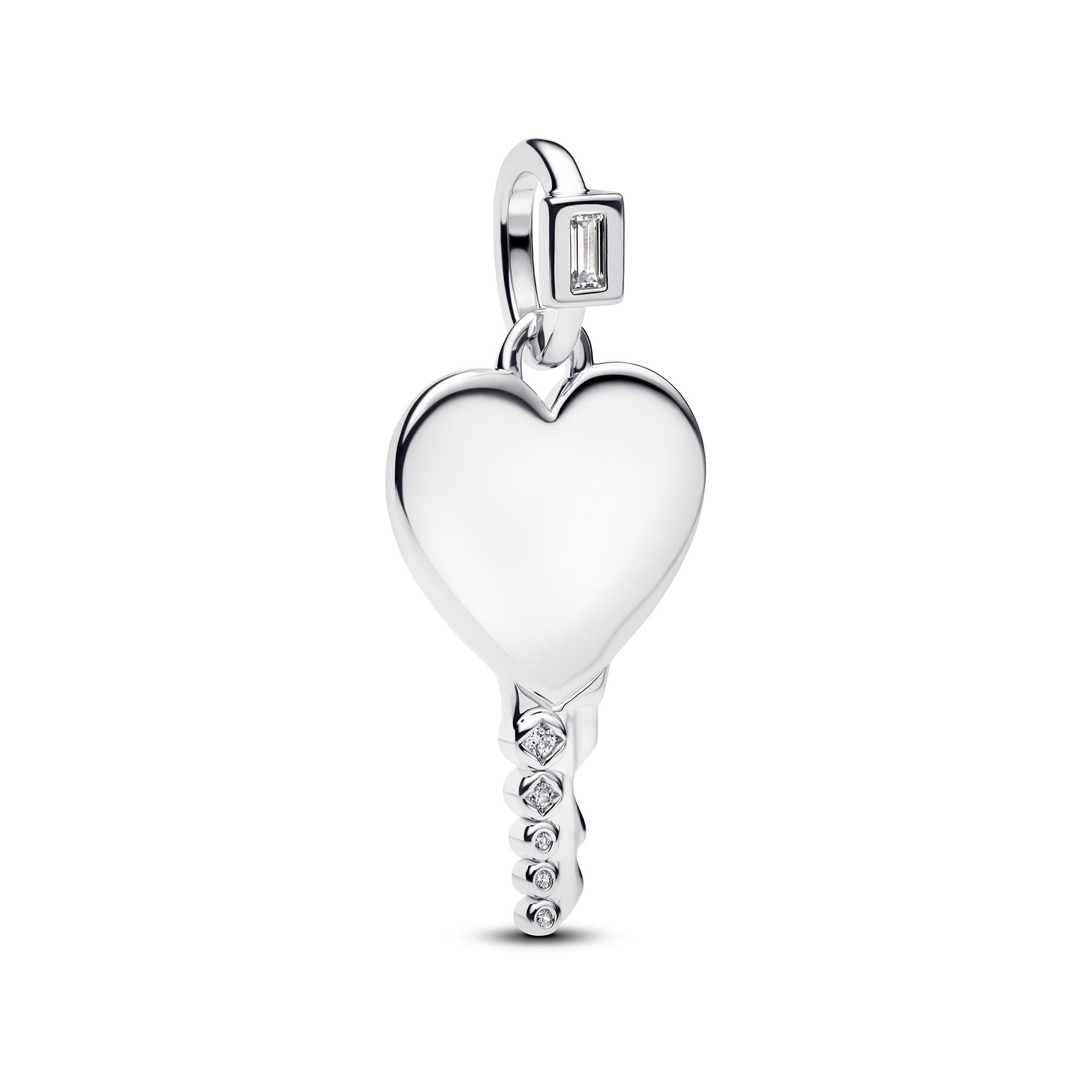 Chiudi la tua storia. Questo portachiavi in argento sterling ha una testa a forma di cuore personalizzabile con incisione, un corpo dettagliato con zirconi cubici scintillanti e un anello di collegamento impreziosito da pietre.