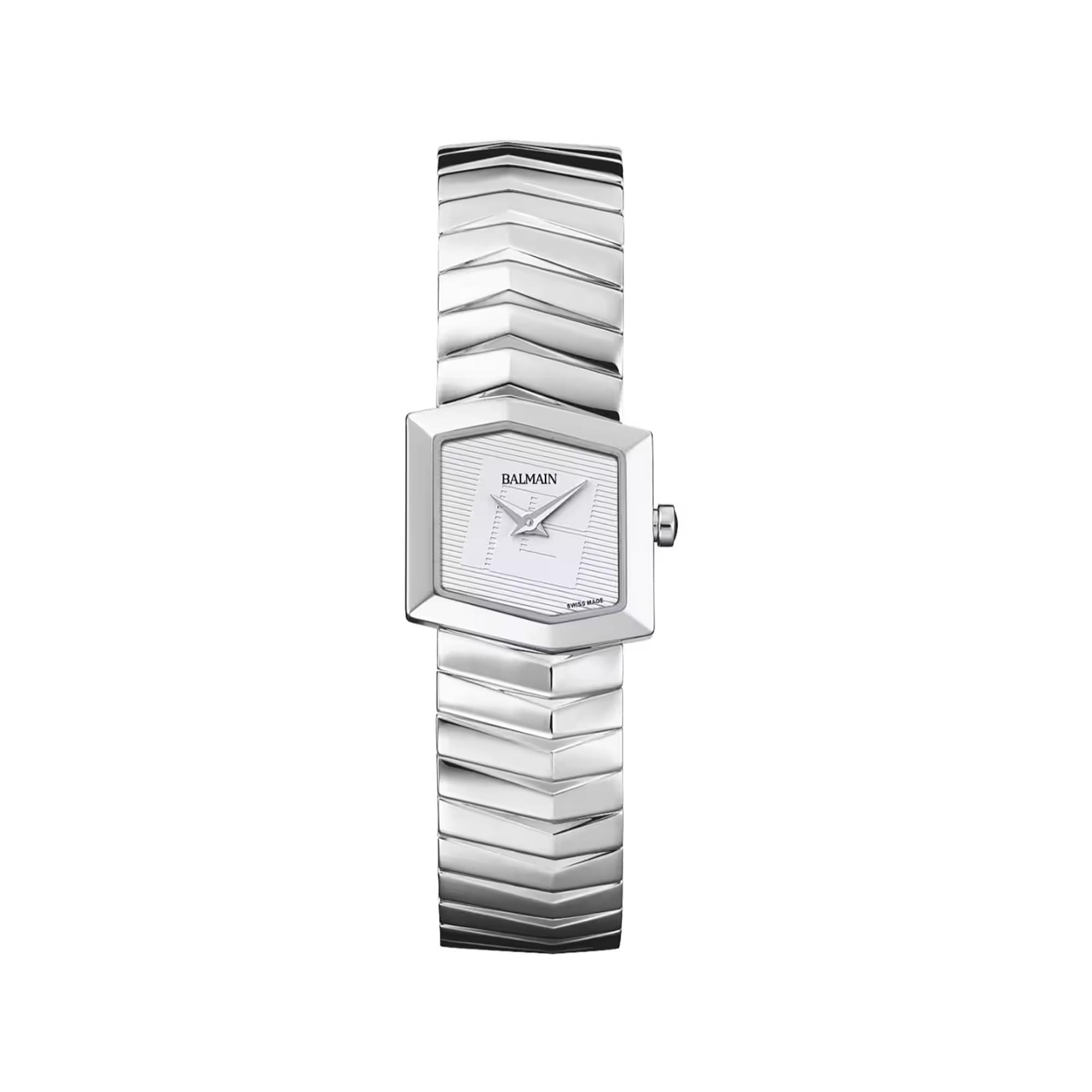 L'orologio da donna Balmain Taffetas unisce un'eleganza asimmetrica moderna a un design ispirato alla gioielleria, distinguendosi per la cassa esagonale in acciaio inox. Il quadrante bianco, il vetro zaffiro e il preciso movimento al quarzo conferiscono a questo orologio Swiss Made una qualità raffinata e duratura.