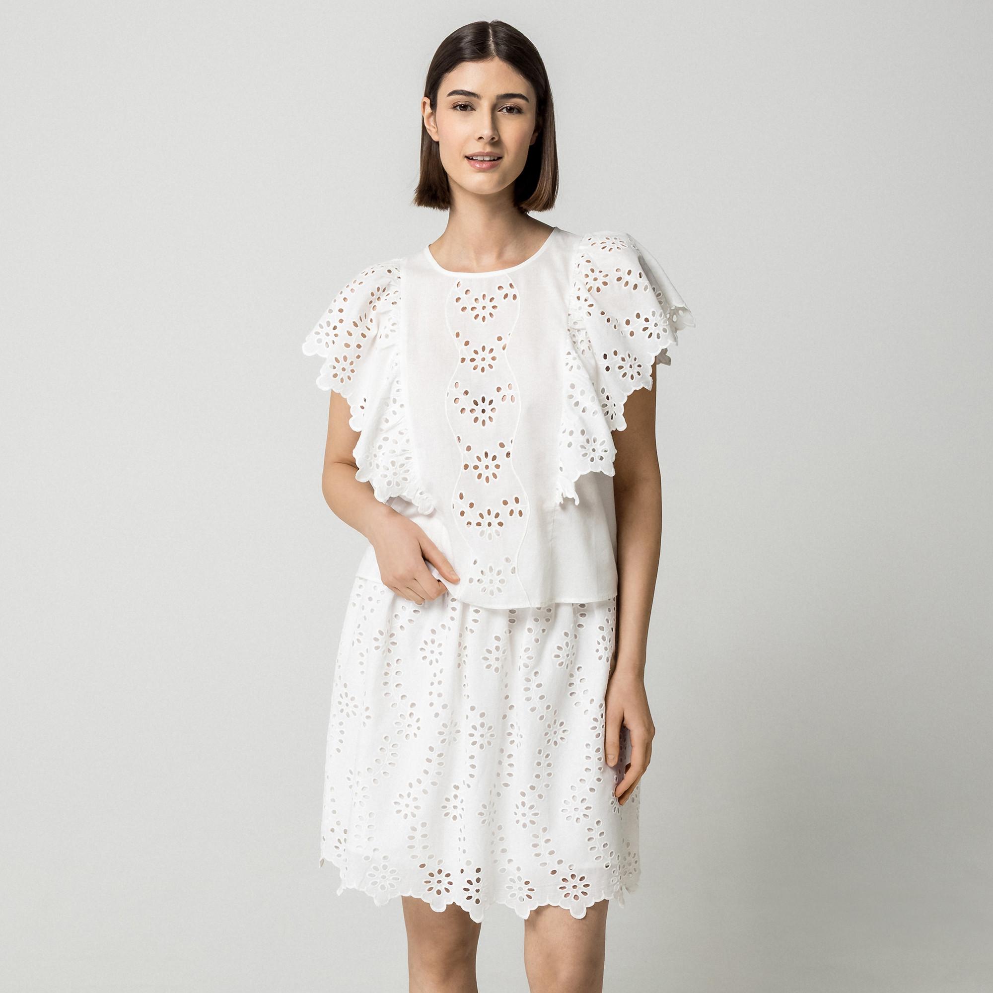 Questo top presenta delicati ricami e affascinanti maniche a balze, creando un look elegante e femminile. Il design include uno scollo rotondo e un dettaglio a goccia sulla schiena, aggiungendo un tocco di eleganza.
