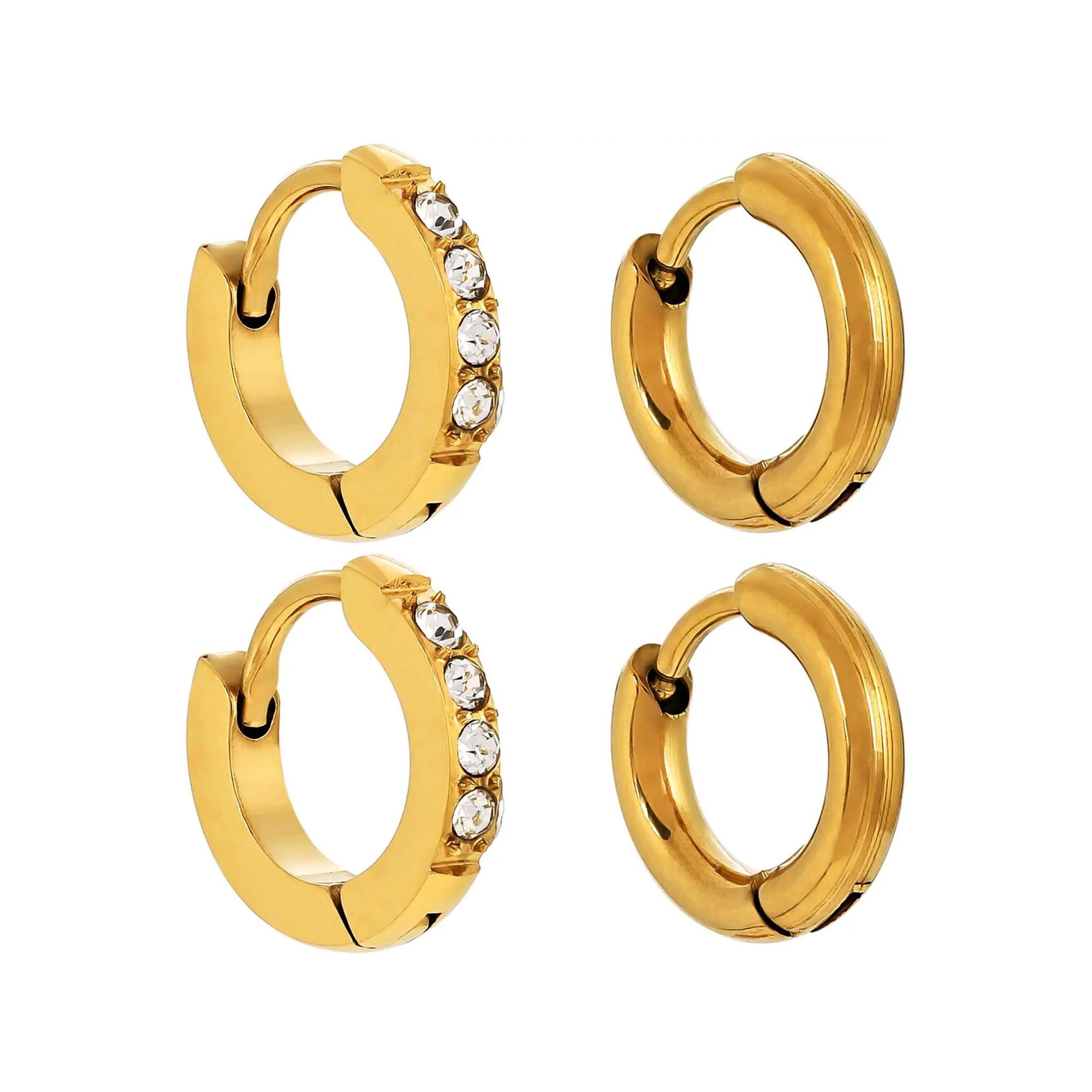 Il set di cerchi - Mini Steel brilla di colore oro ed è composto da due paia di cerchi con design simili. Entrambe le paia sono in acciaio inossidabile impermeabile. Una delle mini-cerchi è decorata con strass scintillanti.