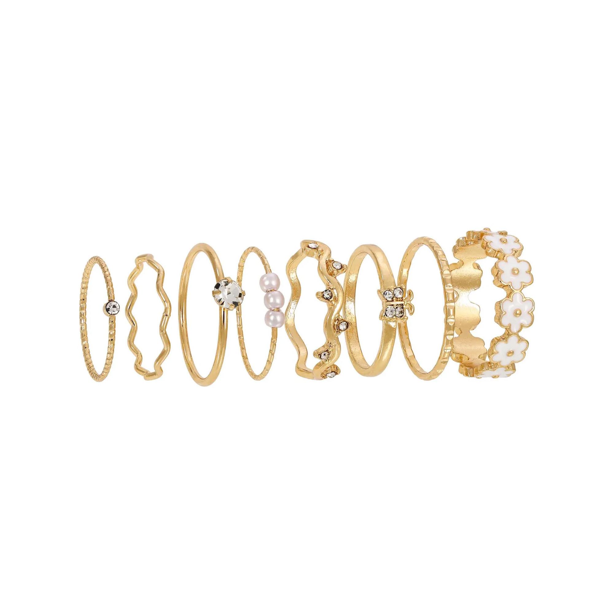 Il set di anelli – Golden Summer scintilla color oro ed è composto da otto anelli con design diversi. Un anello è decorato con perle finte bianche e uno con fiori scintillanti. Alcuni anelli sono decorati con pietre di strass scintillanti.