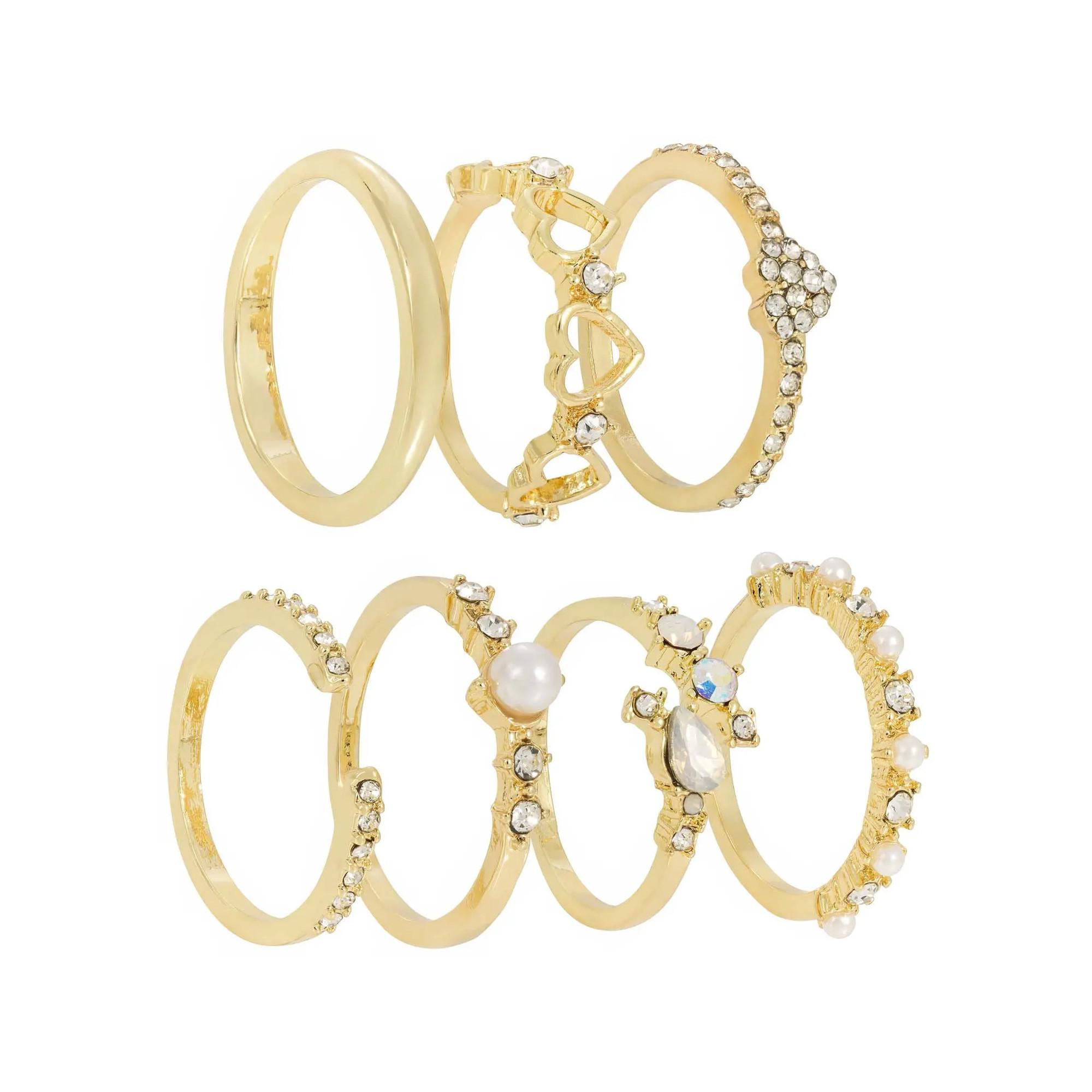 Il set di anelli – Golden Grace scintilla color oro ed è composto da sette anelli con design diversi. Alcuni anelli sono decorati con pietre di strass scintillanti o con perle finte bianche e luminose. Un anello è decorato con piccoli tagli a forma di cuore. Il set è perfetto per un bellissimo stacking di anelli o per molta varietà.