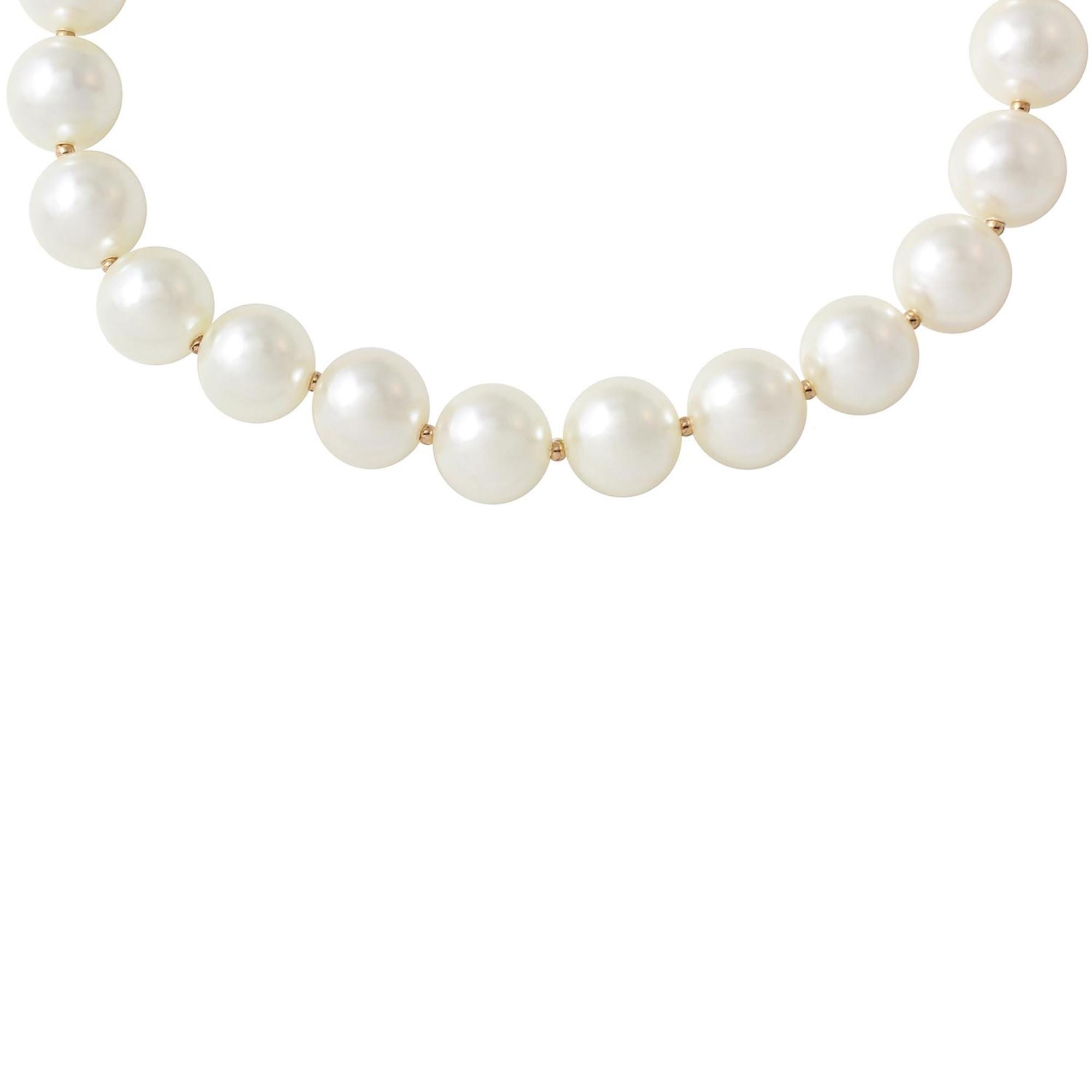 Questa collana corta ed elegante è composta da grandi perle sintetiche color crema, separate con raffinatezza da piccole perle dorate. Con una lunghezza da 45 a 52 cm, dona a ogni outfit un tocco classico ed elegante.