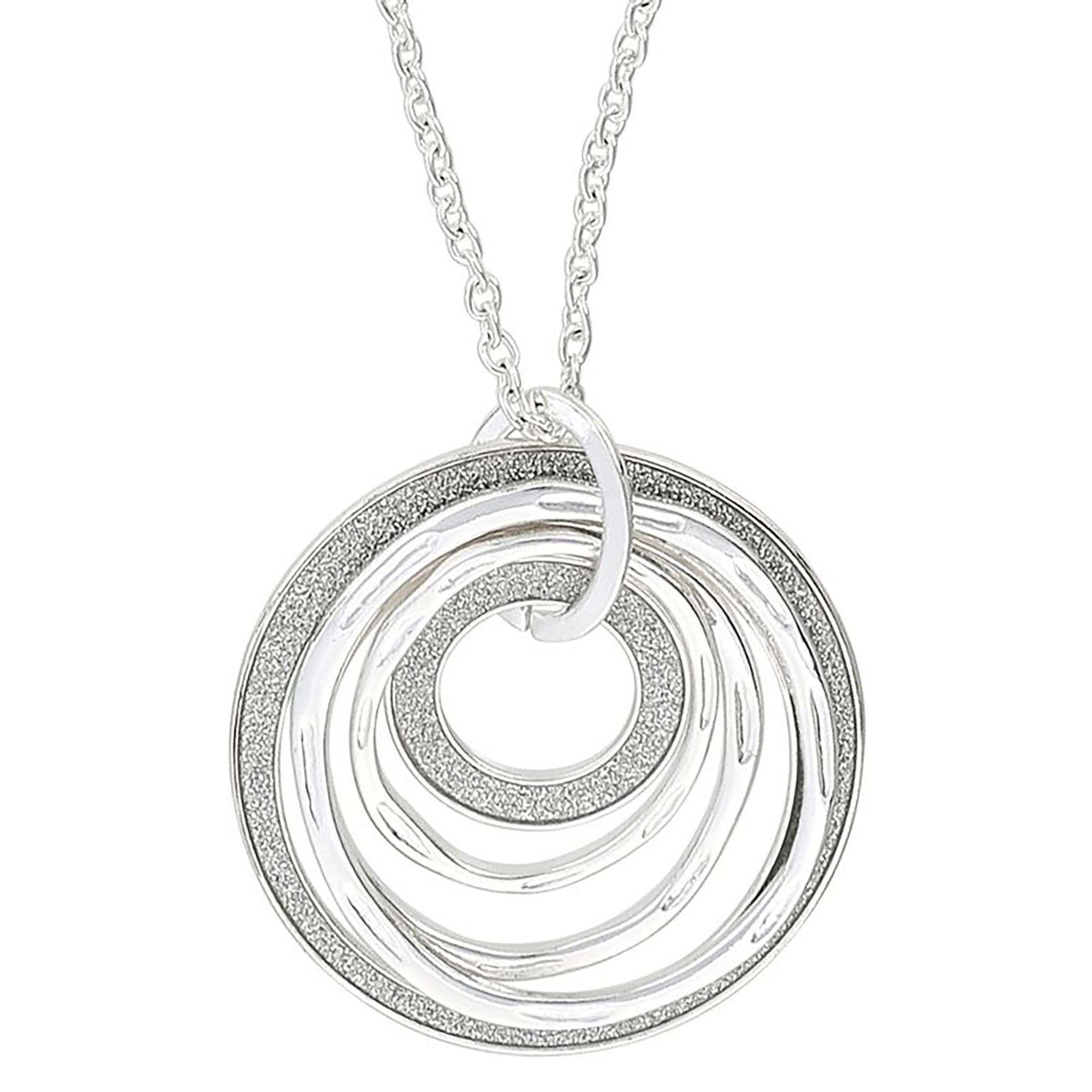 Questa collana color argento si distingue per i pendenti circolari collegati tra loro e decorati con glitter scintillante. La catena di prolunga consente di regolare facilmente la lunghezza.