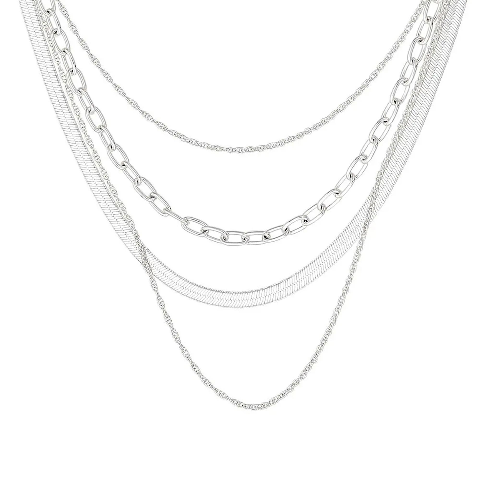 La collana layering - Silver Shine brilla in colore argento ed è composta da quattro file di catene. Una fila è una catena snake e le altre sono catene a maglie. Il classico accessorio si abbina perfettamente!