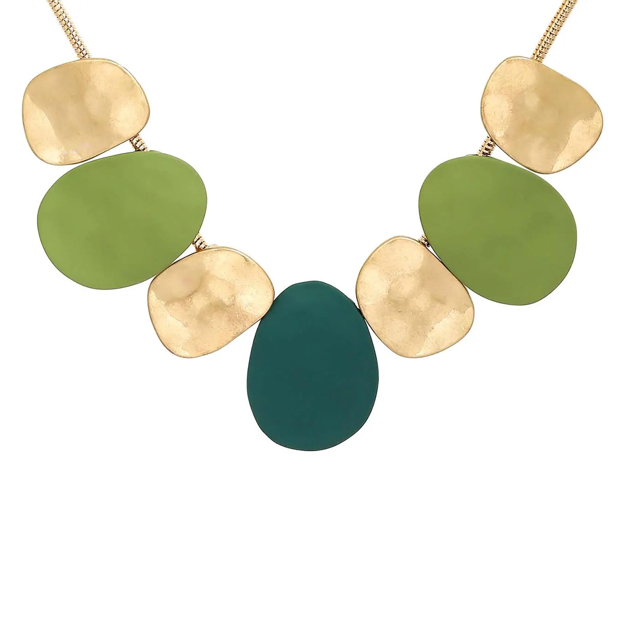 Sentiti regale con la nostra collana dorata e brillante, decorata con ciondoli verdi e dorati in un incantevole effetto martellato. Questa collana è come un tesoro dei tempi passati che ti dona splendore e glamour. I ciondoli dorati emanano calore e ricordano giardini baciati dal sole, mentre il verde aggiunge un tocco di freschezza e vitalità. L’effetto martellato conferisce a ogni ciondolo una texture e una profondità uniche. Indossa questa collana e senti come ti fa risplendere e fa brillare la tua personalità.