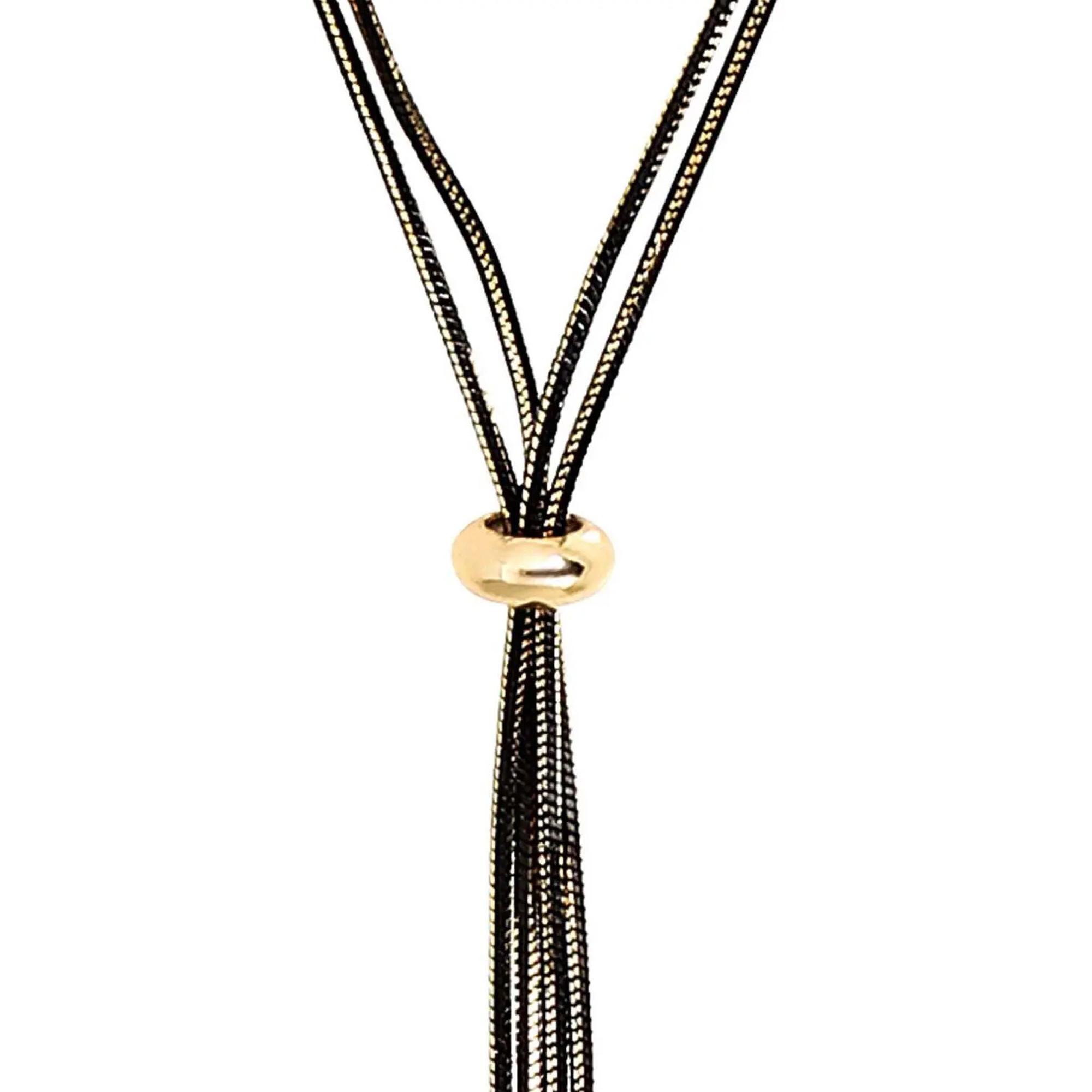 La collana - Golden Sleek è composta da due fili di catena a serpente ed è una collana a Y che brilla in tonalità nero e dorato, con un anello dorato scorrevole al centro. La collana è dotata di una catenina di prolunga.