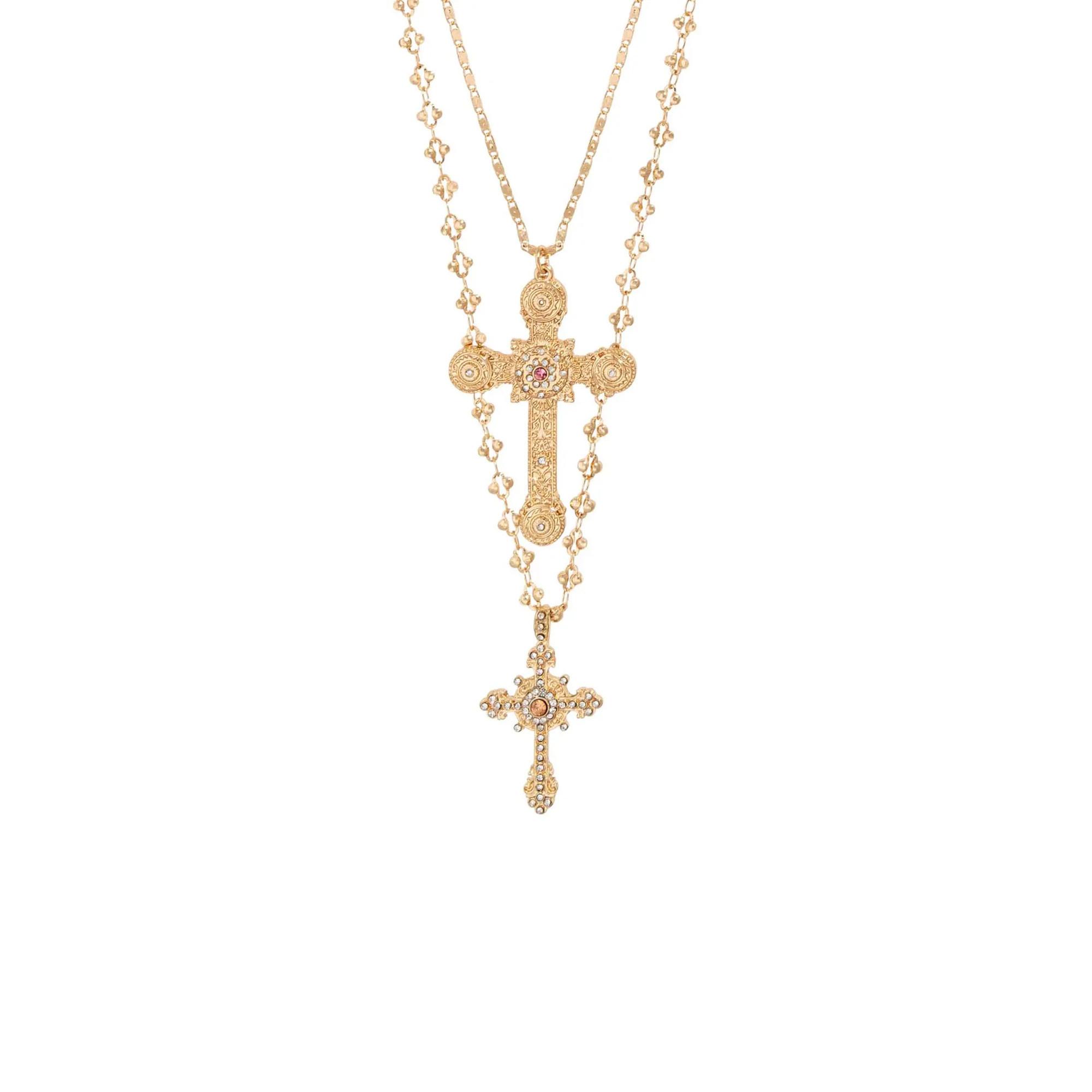 Il set di collane – Cross Duo è composto da due collane con design simili. Entrambe le catene a maglie brillano in tonalità dorata e sono decorate con un ciondolo a forma di croce. Le croci sono decorate con scintillanti strass.
